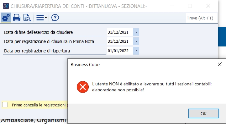Chiusura e riapertura conti --> Non è possibile fare la chiusura e riapertura conti se l'utente è abilitato a lavorare solo sul proprio sezionale altrimenti eseguiremmo una chiusura/riapertura parziale non corretta. Perciò è possibile utilizzare tale programma solo se l'operatore è abilitato a lavorare su tutti i sezionali, in tal modo il programma viene lanciato una volta sola eseguendo per ogni sezionale una registrazione: