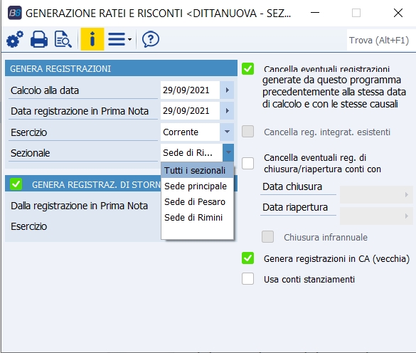 RATEI E RISCONTI E CHIUSURA/RIAPERTURA CONTI Generazione ratei e risconti --> Tale programma può lavorare sia su un solo sezionale o su tutti e crea in automatico la registrazione sui vari sezionali.