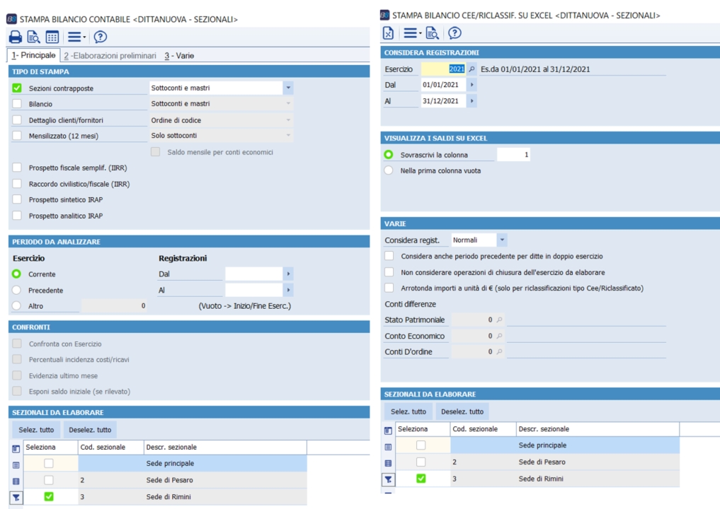 STAMPA BILANCIO CONTABILE/ RICLASSIFICATO CEE SU EXCEL Da questi due programmi è possibile eseguire una stampa per singolo sezionale oppure per un elenco di sezionali, si pre-seleziona quello associato all'utente.