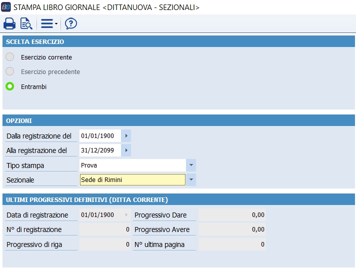 STAMPA LIBRO GIORNALE In tale programma è stato aggiunto il filtro combo (di default viene riportato il sezionale dell'utente) per poter stampare le registrazioni di un solo sezionale alla volta o di più.