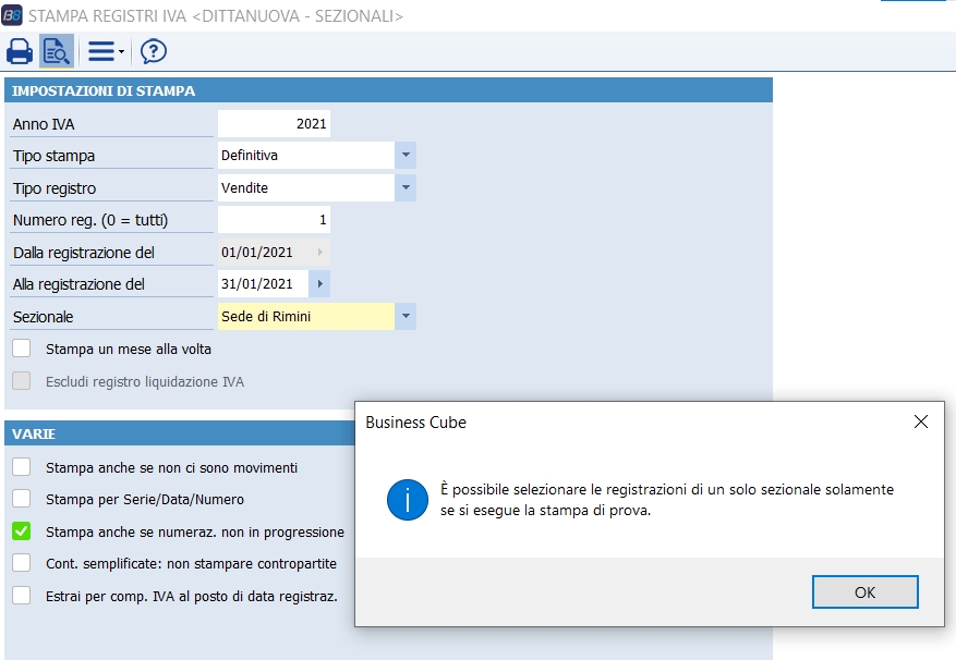 STAMPA REGISTRI IVA In tale programma è stato aggiunto il filtro combo (di default viene riportato il sezionale dell'utente) per poter stampare le registrazioni di un solo sezionale alla volta o più.