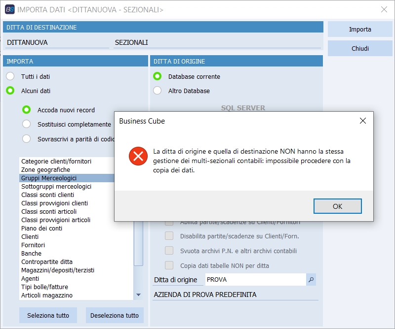 COPIA/ELIMINA DATI DITTA Se utilizzo il programma copia/elimina dati ditta per copiare i dati da una ditta all'altra, con attiva la gestione dei multisezionali, tutte e due le ditte devono avere la stessa gestione dei sezionali: