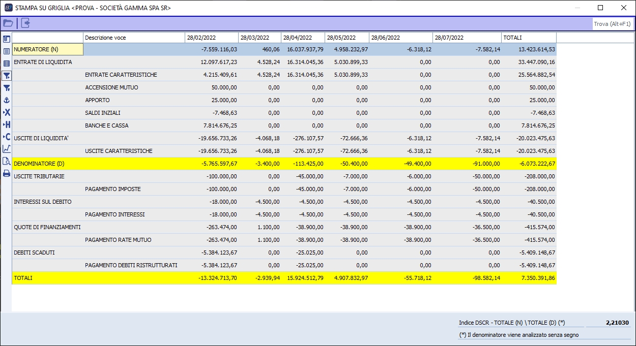 Il D.lgs. 12 gennaio 2019, n. 14 ha inserito nel nostro ordinamento il nuovo Codice della crisi d'impresa e dell'insolvenza (C.C.I.), sostituendo integralmente la previgente Legge fallimentare (Regio decreto n. 267/1942). La nuova normativa ha previsto degli indicatori di crisi da monitorare che possono essere spia di una situazione di insolvenza. Sono 7 gli indicatori ma questi primi due incidatori sono quelli, che se prensenti, sufficienti per soddisfare il requisito normativo: • Patrimonio netto negativo • DSCR (Debt Service Coverage Ratio) L'obiettivo del legislatore è quello di prevenire situazioni in cui l'impresa non sia in grado, con i flussi di cassa disponibili, di pagare regolarmente i propri debiti in un'ottica previsionale/prospettica. Il modulo fornisce gli strumenti per il calcolo dell'indice DSCR previsto dalla nuova normativa Esprime la capacità prospettica di coprire i debiti da pagare con i flussi di cassa in entrata previsti in un orizzonte temporale di almeno 6 mesi. Il metodo utilizzato da Business è il metodo diretto che si sostanzia nel calcolo di rapporto tra due grandezza. Al numeratore vi è il FCOF composto dalla Disponibilità di liquidità iniziale sommato alle Entrate di cassa e detratte le Uscite di cassa diverse dai debiti finanziari. Al denominatore vi è la somma dei Debiti finanziari (mutui, leasing) pari al valore totale delle rate da rimborsare + imposte e tasse da pagare + quota di interessi da pagare + quota di debiti operativi scaduti e rateizzati (da ristrutturazione). Tale indice, per esprimere una situazione di equilibrio deve essere maggiore di 1 Nel NUMERATORE devono andare le disponibiltà di cassa iniziale + entrate di cassa e uscite di cassa diverse dai debiti finanziari. Nel DENOMINATORE devono andare i debiti finanziari pari al valore totale delle rate da rimborsare+ imposte e tasse da pagare + quota di interessi da pagare + quota di debiti scaduti o rateizzati (da ristrutturazione). Ad ogni sottoconto contabile o scadenza (scadenze anche extracontabili) che devono confluire in questo indicatore DSCR, dovranno essere associati le voci finanziari DSCR e per ogni voce dovrà essere indicata se attribuirla al numeratore o al denomiantore (impostazione fa effetture dalla tabella Voci Finanziaria DSCR Dettagli). esempio di prospetto