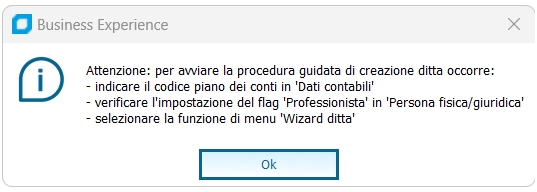 La funzione Wizard permette di effettuare la creazione della nuova ditta seguendo un percorso guidato che propone in sequenza quelle che sono tutte le informazioni necessarie per la nuova ditte e tutte le possibili opzioni presenti che possono essere o menù spuntate in base alle caratteristiche che le si vogliano attribuire.