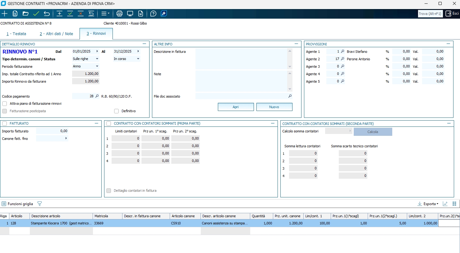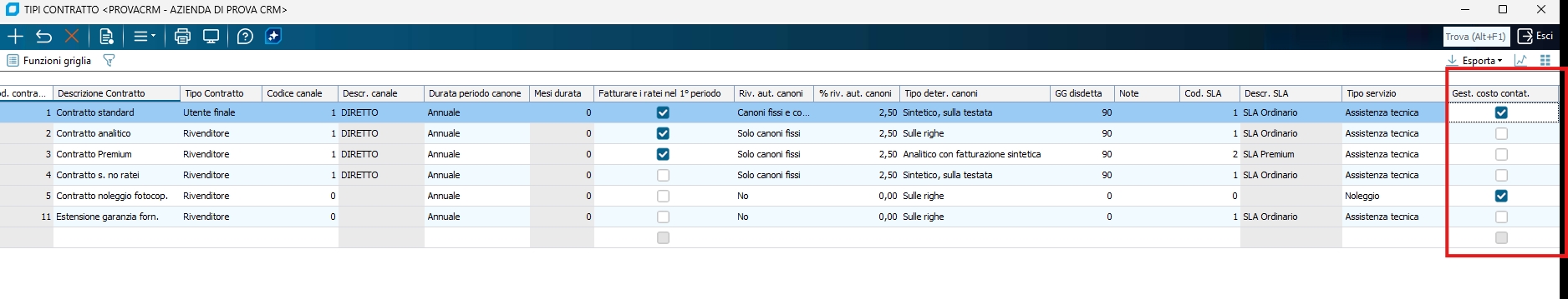 - settare in tabella 'Tipi Contratto' se trattasi di assistenza o noleggio, e se (importante) si vuole gestire il 'Costo per contatore' (deve essere attivato)