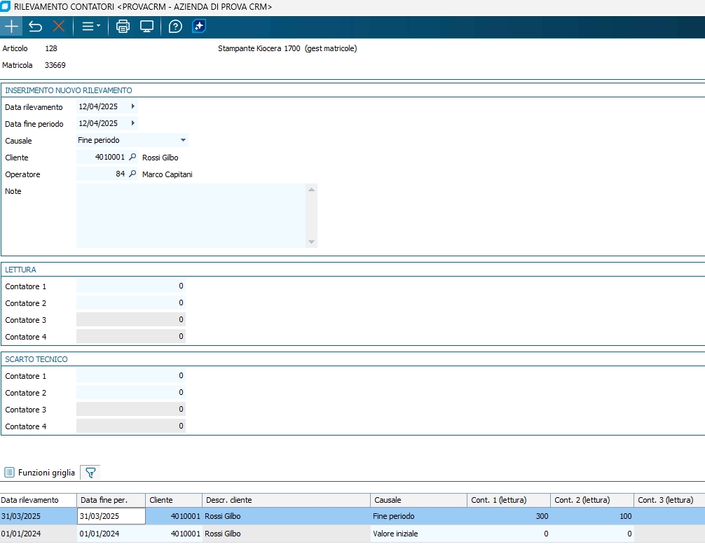 - deve essere possibile registrare periodicamente le letture dei contatori su ciascun apparecchio sottoposto a contratto di assistenza o di noleggio