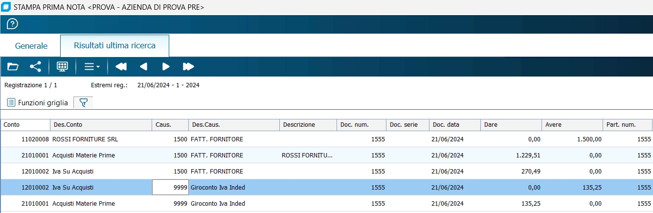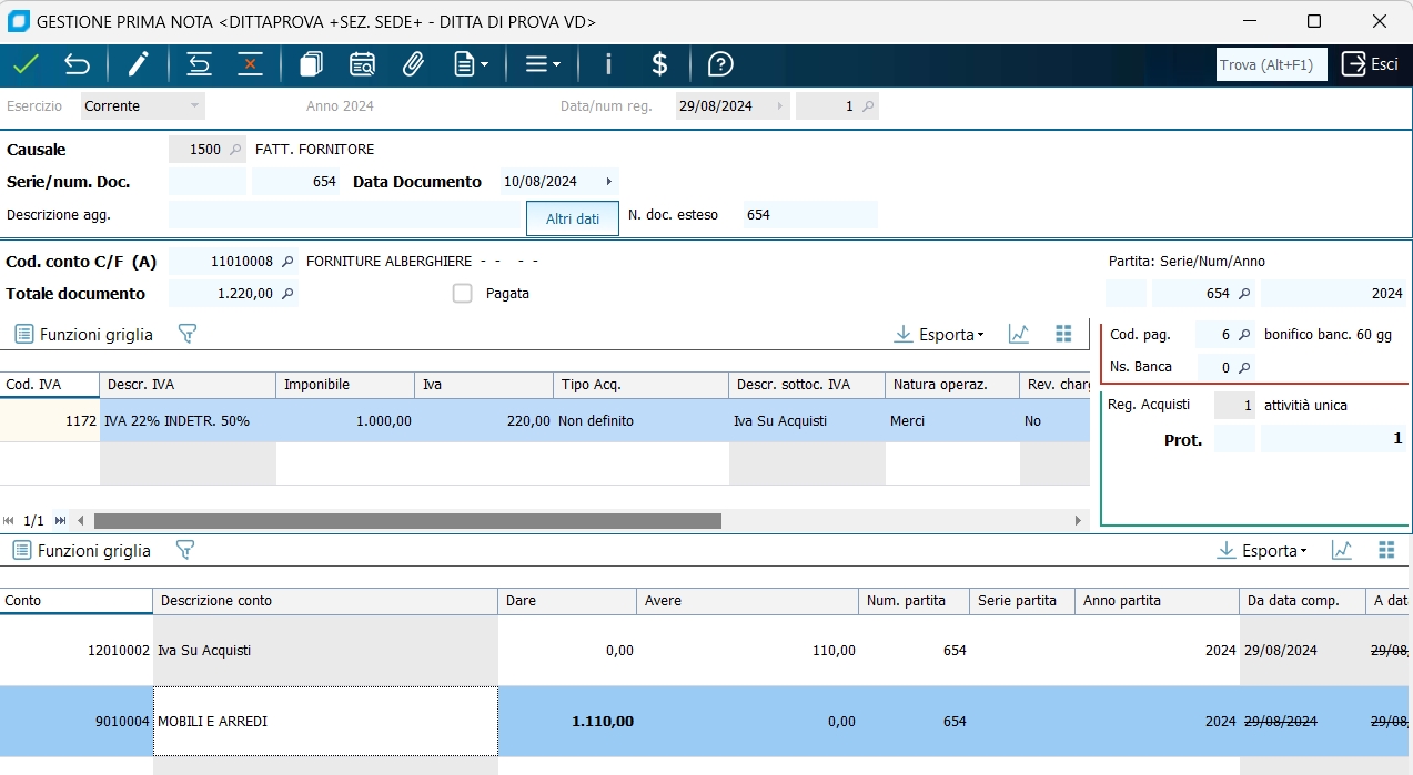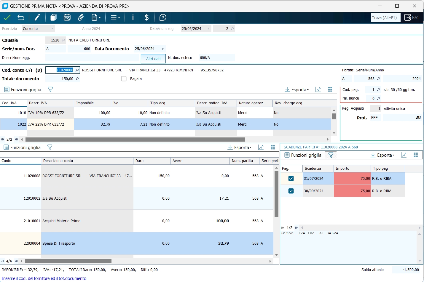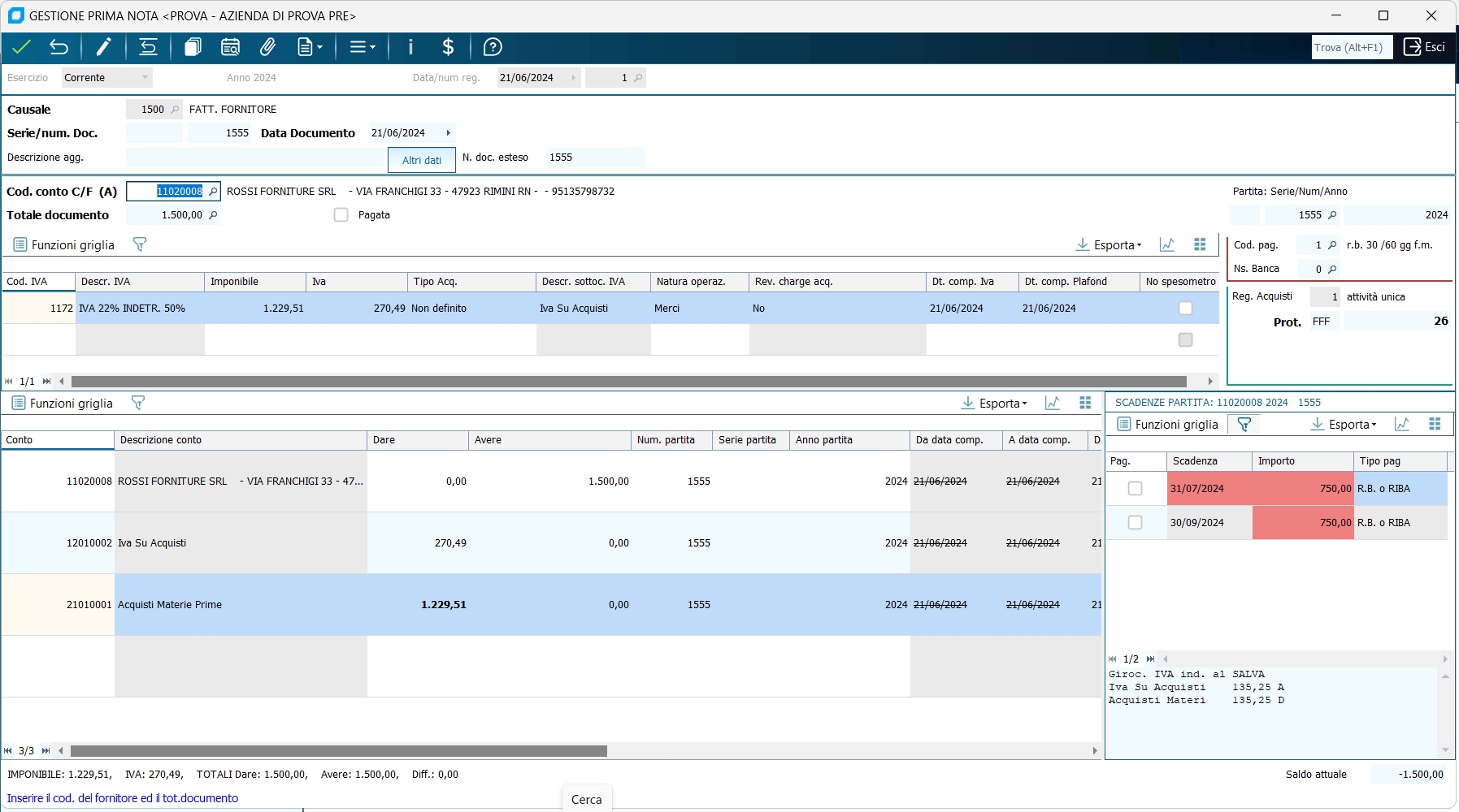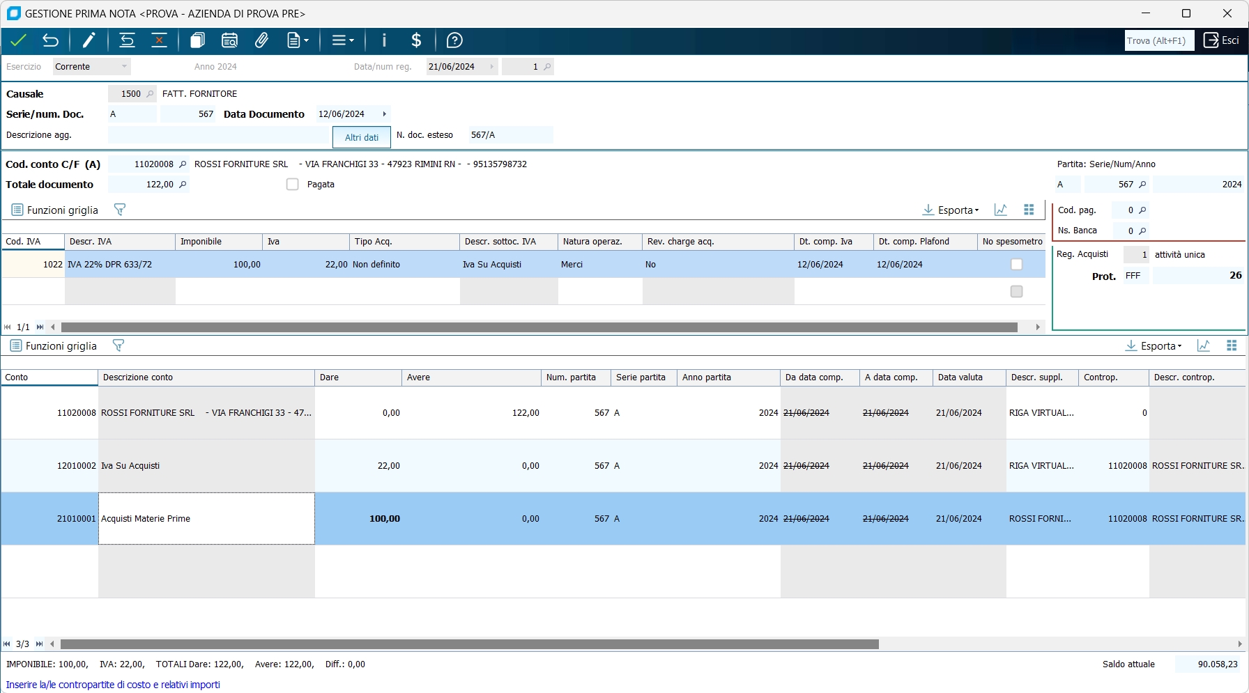 1 - Fattura di acquisto con una aliquota IVA ed una contropartita di costo : (imponibile 100,00, IVA 22%, fornitore ROSSI FORNITURE SRL, costo MERCI C/ACQUISTI) senza aggiornamento dello scadenzario