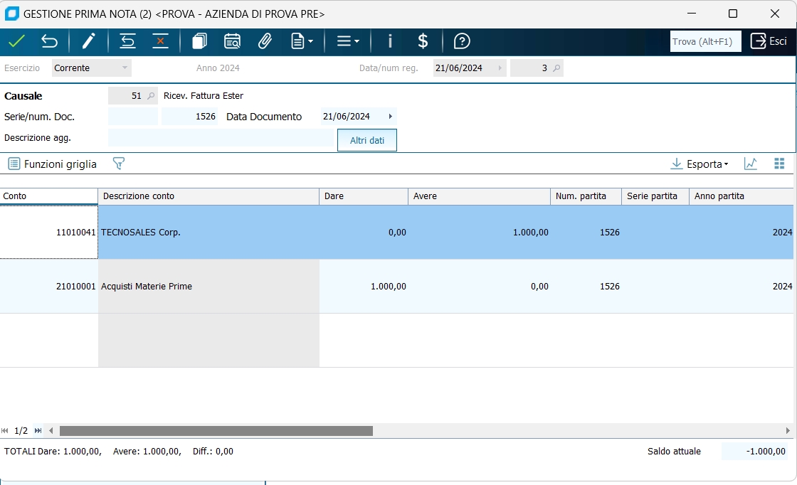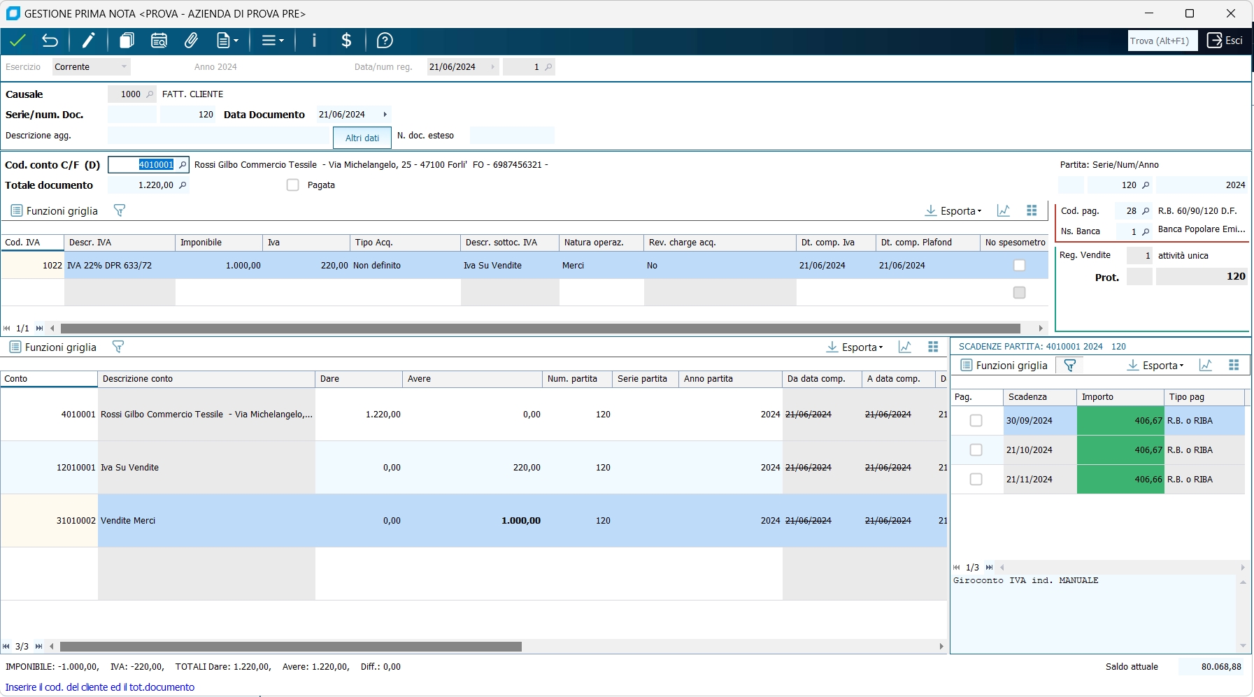 Il numero di partita è obbligatorio qualora per il fornitore sia dichiarata la gestione a partite oppure la gestione dello scadenzario. La registrazione di una fattura di vendita viene effettuata secondo lo stesso criterio (sostituendo opportunamente il fornitore in avere con un cliente in dare , ed il conto di costo in dare con un conto di ricavo in avere). Unica differenza sostanziale è che il numero (e la serie) di protocollo corrisponde (solitamente) al numero documento stesso, che costituisce pertanto il numero progressivo da riportare sul registro IVA vendite.