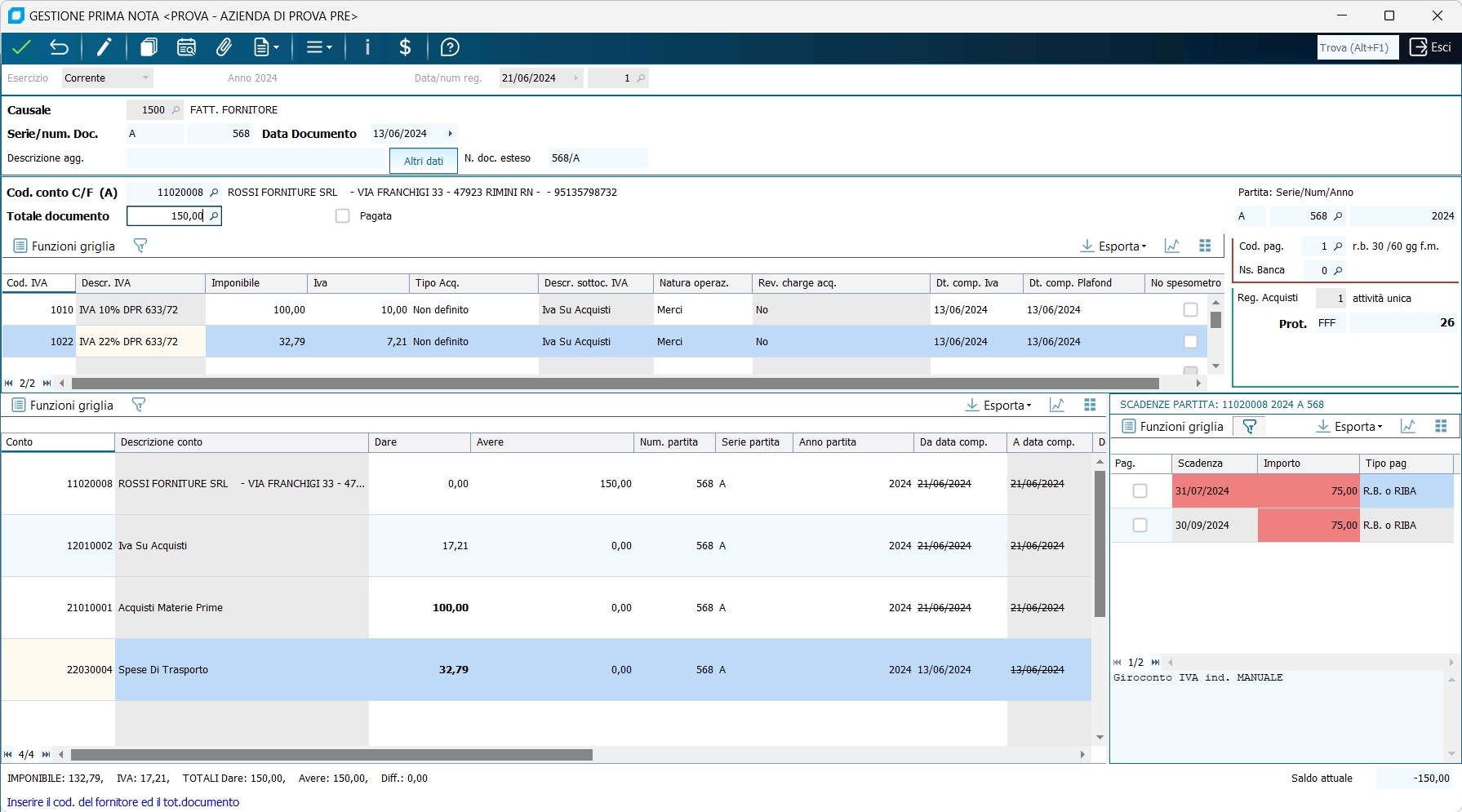 2 - Fattura di acquisto con due aliquote e due contropartite di costo con aggiornamento dello scadenzario passivo: (Totale documento : 150,00, Impon. 10% : 100,00 IVA 10,00 -- Impon. 22% : 32,79 IVA 7,21) Pagamento: RB 30/60 gg F.M. Con il cursore sul campo Conto C/F oppure Totale Documento, con ALT+S oppure cliccando sul pulsante 'Scadenzario:' (qualora per il fornitore sia stata dichiarata la gestione delle scadenze ) il programma entra nella finestra dello scadenzario. Indicando codice pagamento e codice banca di pagamento, il programma provvede a generare automaticamente le scadenze :