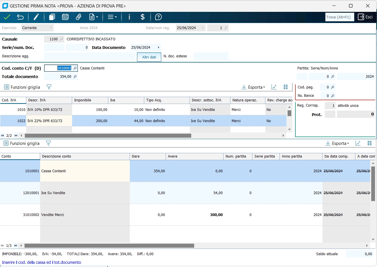 4 - Corrispettivo del giorno (non in ventilazione) Totale corrispettivo : 100,00 al 10% + 200,00 al 22% + (importi IVA compresa) Si consiglia di imputare prima la causale, poi il castelletto IVA (dopo aver digitato 110,00 nel campo Imponibile premere Enter seguito da un click sul pulsante scorpora, idem per 244,00), poi completare con la cassa in dare in alto, e la contropartita ricavo per la somma degli imponibili in avere.