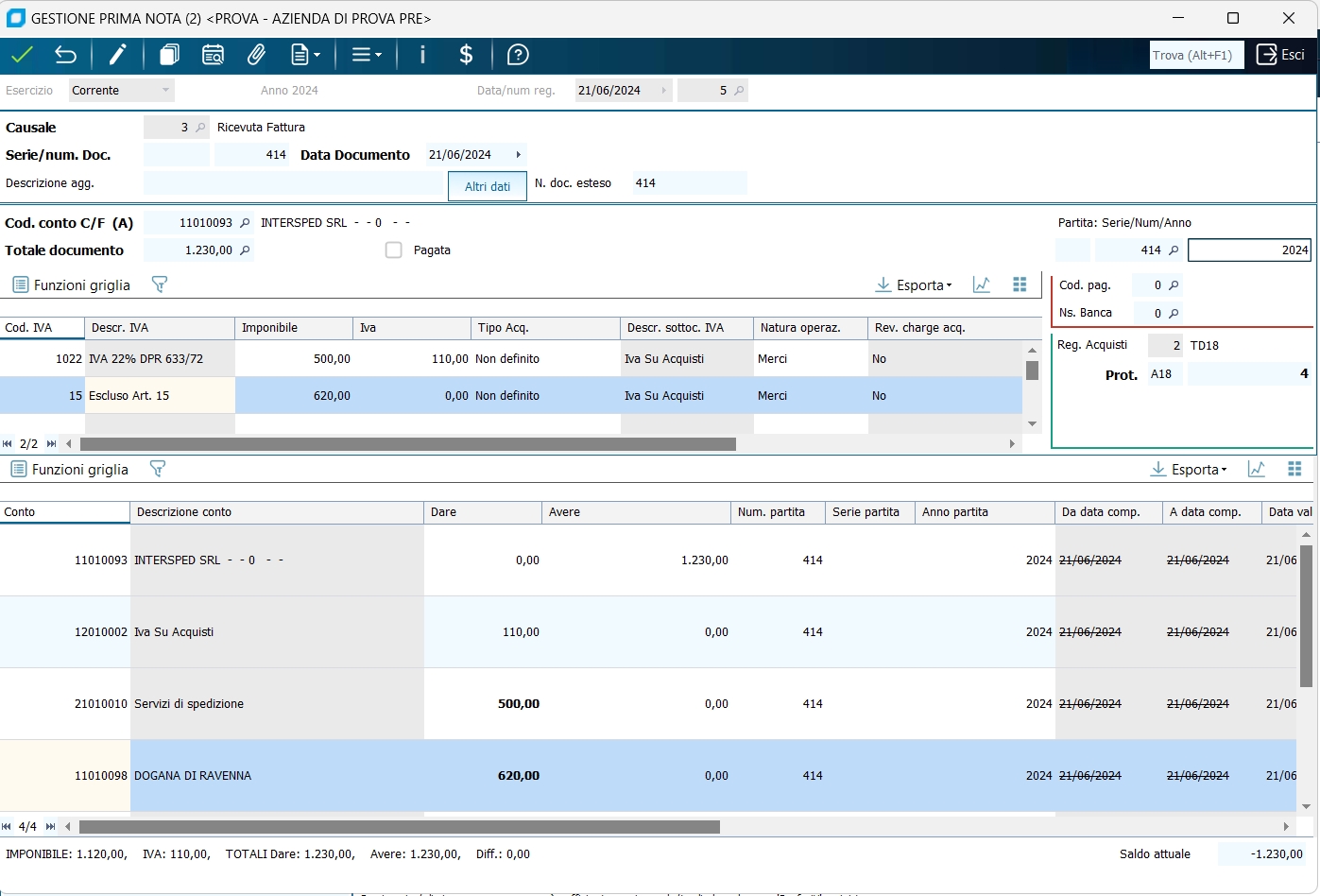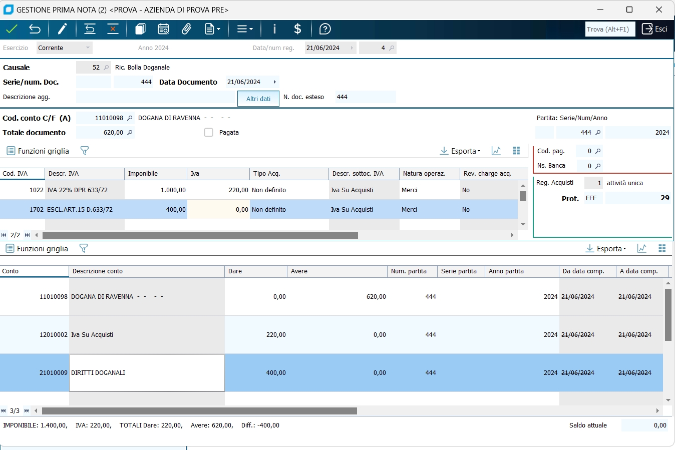 6 - Bolletta doganale con una aliquota IVA ed una contropartita di costo, e relativa fattura dello spedizioniere. La registrazione è composta solitamente da 3 registrazioni elementari. La prima è la rilevazione della fattura estera, senza IVA e con una causale FATTURA ACQ.ESTERA senza indicazione del tipo registro IVA (essendo una causale che non deve interessare il registro IVA acquisti) . Pertanto andrà registrata con la funzione Gestione Prima Nota