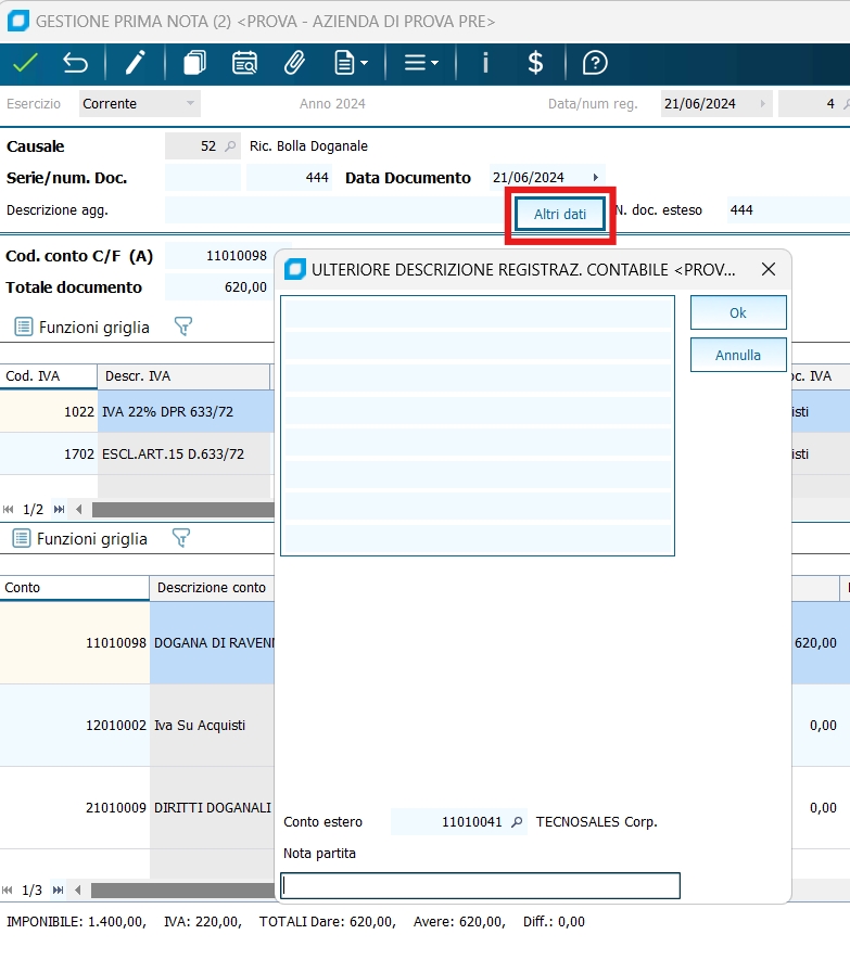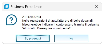 La seconda è la rilevazione della bolla doganale vera e propria. Si utilizza a tal scopo un fornitore BOLLE DOGANALI (oppure DOGANA DI COMO,e cc.), una causale RIC.BOLLA DOGANALE (costruita come la causale RICEVUTA FATTURA) e si utilizza Gestione Prima Nota Iva Al salvattaggio della registrazione verranno restituiti due messaggi, uno relativo alla differenza tra il totale documento ed i8mponibile più imposta, da confermare il secondo messaggio è relatvo alla bolla doganale e alla possibilità di indicare il conto delfornitore estero negli altri dati. Selezionare no per procedere con l'inserimento del conto del fornitore estero nella sezione altri dati. La terza, quando esiste, rappresenta invece la fattura dello spedizioniere che ha anticipato per nostro conto l'iva ed i diritti alla dogana, e quindi comprende i suoi compensi e l'importo (escluso art. 15) della IVA e di eventuali diritti doganali.