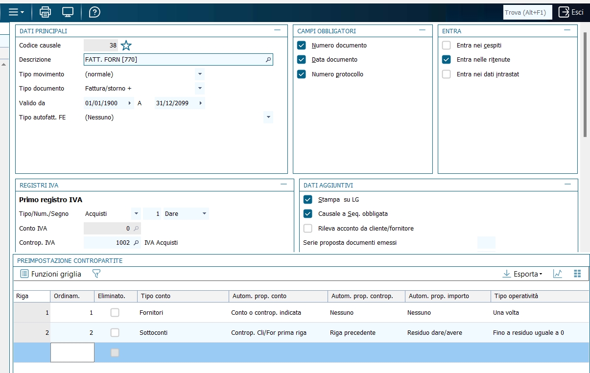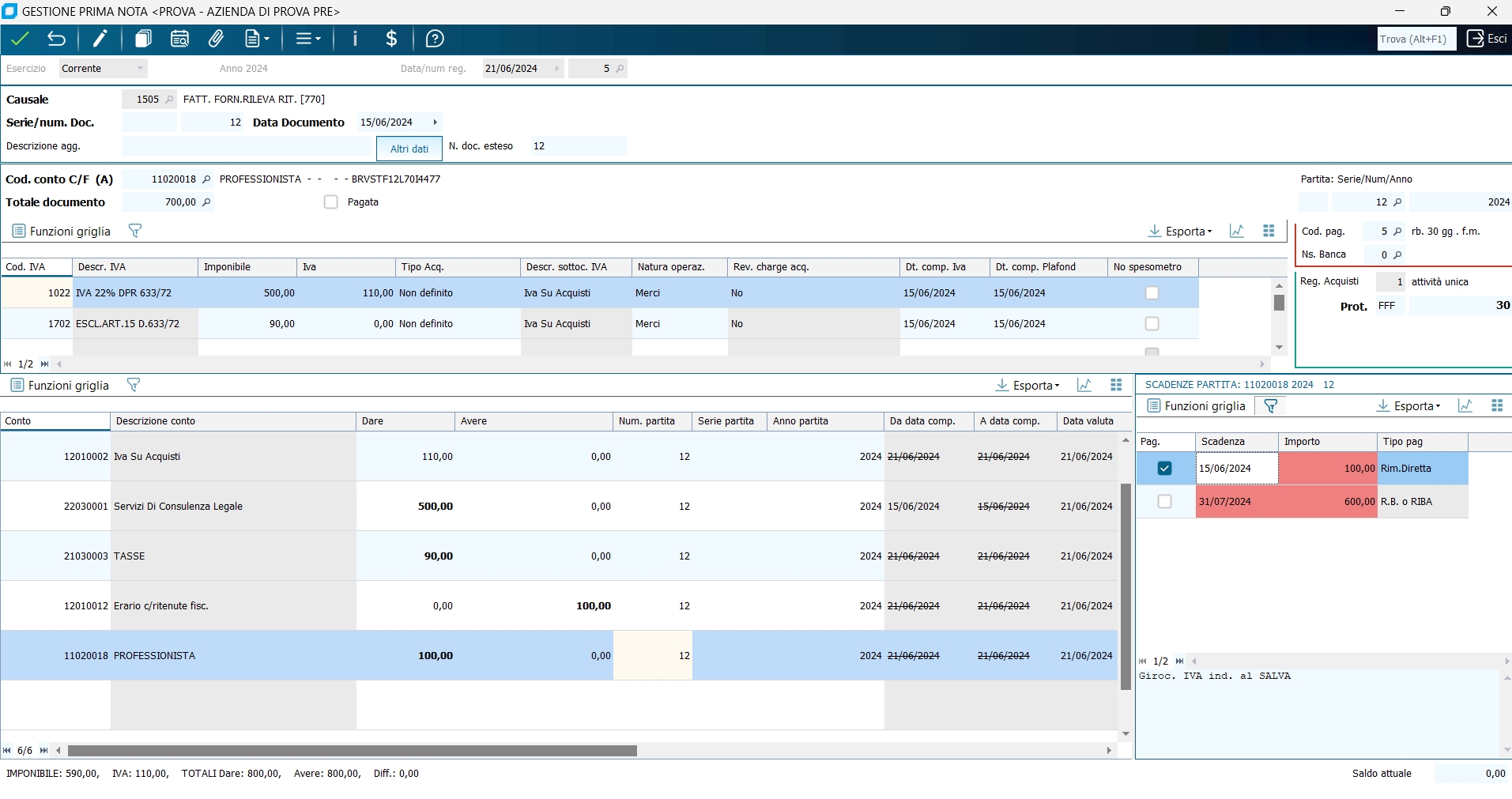 Attenzione: per poter effettuare la registrazione dello spedizioniere sopra indicata, la causale di contabilità deve essere importata senza Preimposatazioni contropartite, oppure se presenti le preimpostazioni contropartite, nella riga di sottoconto, il campo "Tipo Operatività" deve essere impostato a "Una sola volta". 7 - Fattura da professionista (notaio) con applicazione di ritenuta d'acconto. Totale compenso : 500,00 Iva. 22% : 110,00 Rimborsi spese : 90,00 Escl. art 15 Ritenuta d'acc. : 20% su 500,00 = 100,00 Totale netto avere professionista : EUR. 600,00 Totale fattura : 700,00 (supponiamo di registrare la fattura e già la ritenuta, ma non il pagamento della fattura stessa, che sarà oggetto di una registrazione a parte che provvederà a saldare le 600,00 del netto avere prof.: in realtà possono aversi casi diversi : per es. registrare in unica reg. ricevimento fattura, pagamento e rilev. ritenuta; oppure reg. della sola fattura e in un successiva registrazione rilevare la ritenuta ed il pagamento del netto. Si consiglia, normalmente, di rilevare la ritenuta sempre con il ricevimento della fattura. L'obiettivo di avere uno scadenzario delle ritenute si può ottenere al meglio con le stampe fornite dal modulo 'Gestione Ritenute', indipendentemente dal sistema contabile utilizzato per la rilevazione del debito verso l'Erario. In particolare, risulta 'obbligatorio' utilizzare il criterio sopra indicato quando si utilizza il modulo 'Gestione ritenuto' in modalità integrata con la contabilità generale (vedi la parte della guida che parla della modalità di integrazione tra gestione ritenute e gestione contabilità).