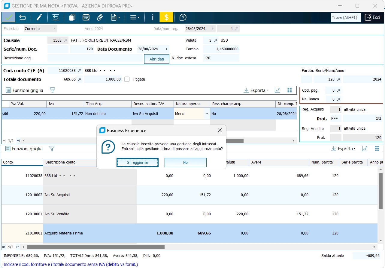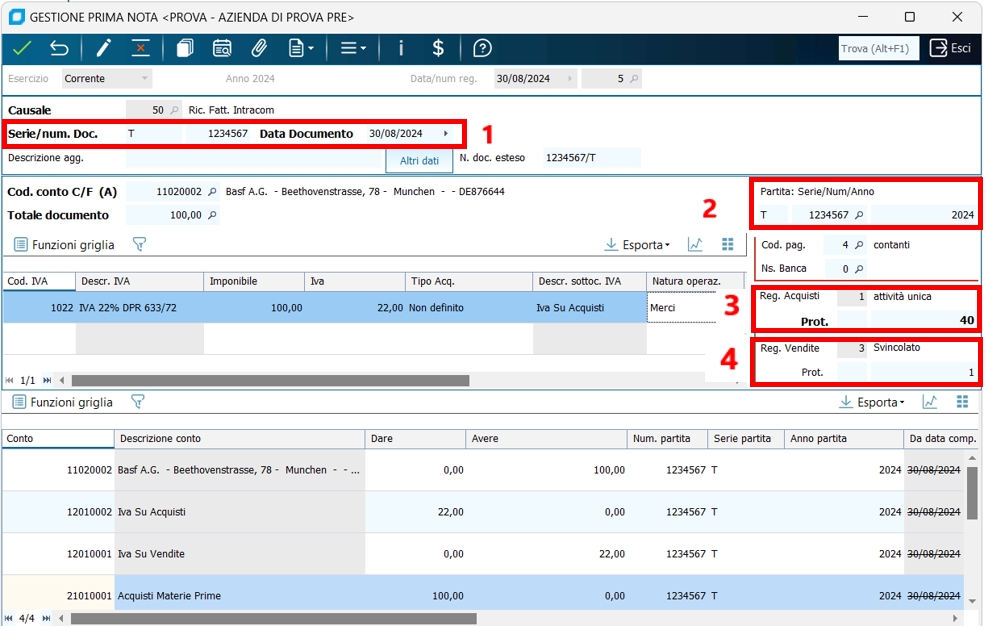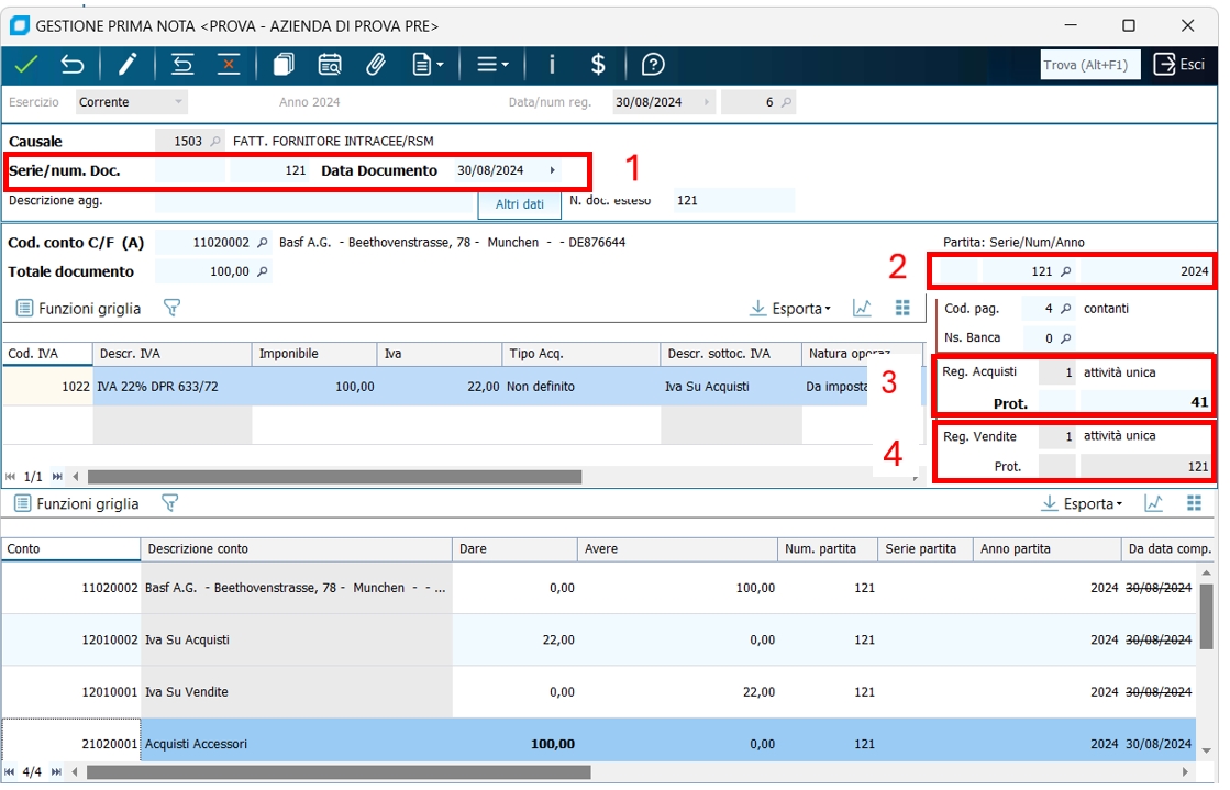 13 - Gestione registrazioni acquisto RSM/Intracee e registri IVA, con relazione documenti/protocolli di vendita "coincidenti". Occore fare una premessa, quando si registra una fattura di acquisto RSM/Intracee oltre al registro IVA acquisti viene movimentato anche il registro IVA vendite per l'autofattura. Facciamo un esempio di registrazione di fattura ricevuta intracee, notiamo che: