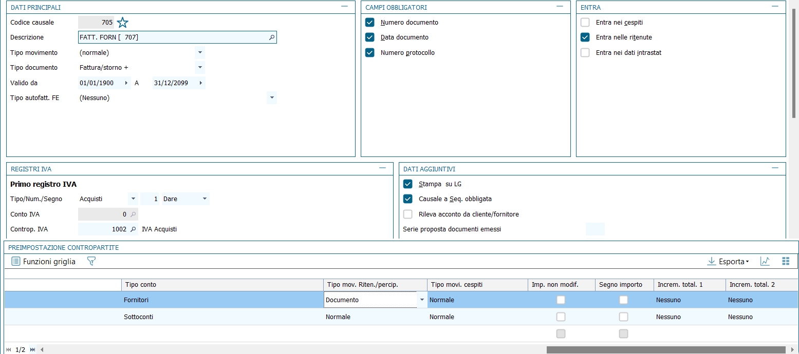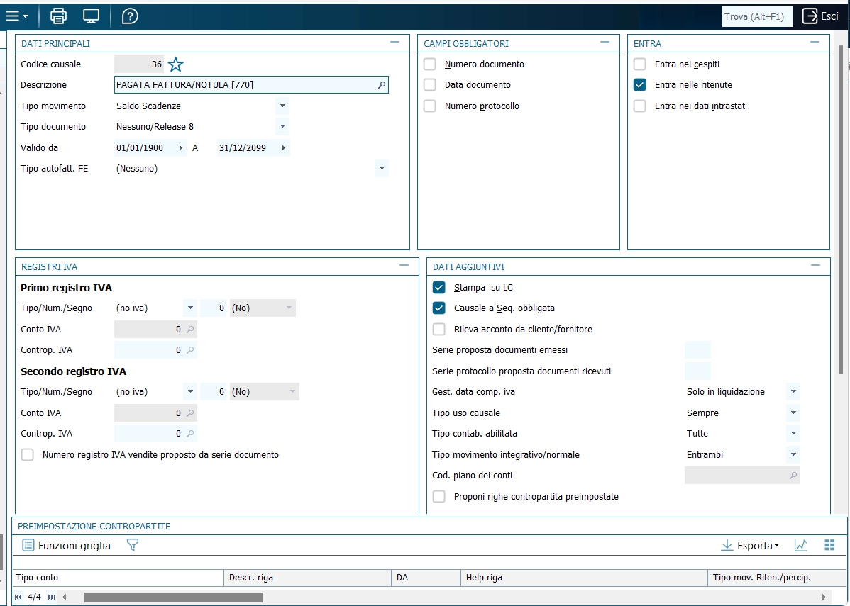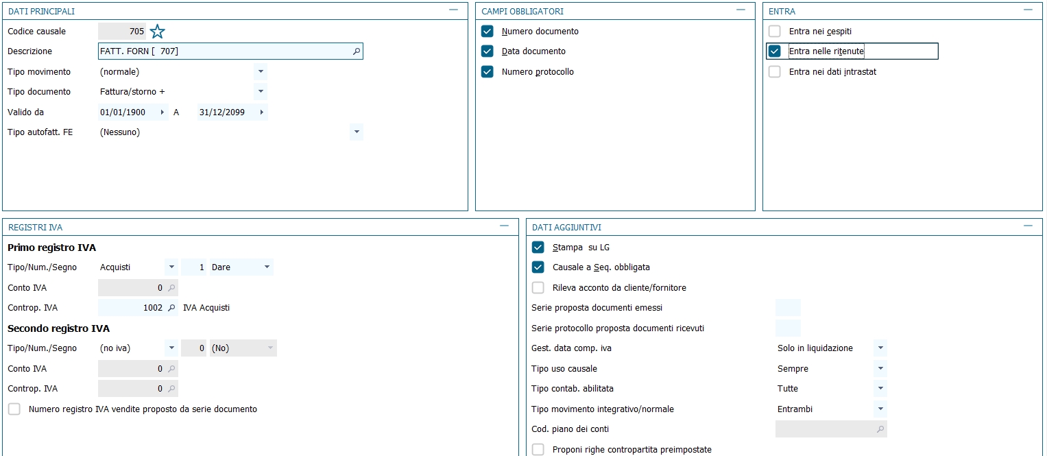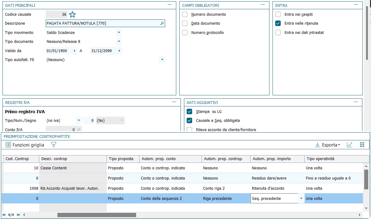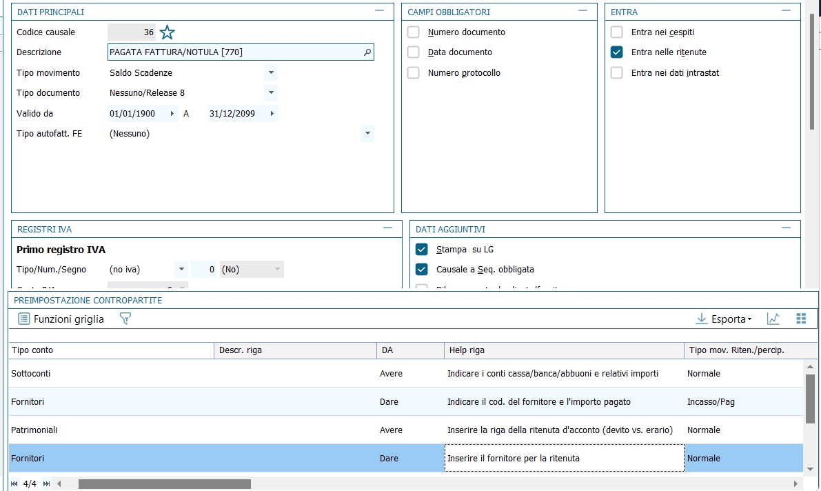 Al salvataggio è richiesto di compilare le righe del modello intrastat adatto alla movimentazione intracomunitaria. L'automatismo è assicurato dal fatto che nell'anagrafica del fornitore/cliente è selezionato "tipo di soggetto IVA = intra-UE". La compilazione della parte "fiscale" si completa coi campi: codice fornitore, Stato, codice identificativo Iva, ammontare delle operazioni, provincia d'origine. 12 - Fattura ricevuta con ritenuta d'acconto rilevata al momento del pagamento Per gestire le registrazioni delle ritenute sul piano contabile in modo da rilevare il debito verso l'erario al momento del pagamento della fattura professionista (e non al momento della registrazione della fattura), sia nella modalità integrata di gestione delle ritenute, sia in quella non integrata, occore utilizzare le due causali indicate in seguito, in alternativa a quelle standard proposte nella tabella standard delle causali distribuite. La registrazione della fattura avviene come una normale fattura di acquisto; nella causale contabile l'unica particolarità è che sulla riga del fornitore il Tipo movimento ritenute/percipienti è impostato su Documento.