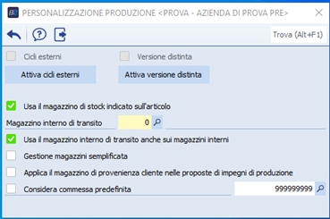 Nel caso in cui si desideri il recupero del magazzino interno transito, per i fabbisogni indipendenti con magazzino indicato come interno esterno, dal magazzino di stock dell'anagrafica articolo sarà possibile attivare l'apposito opzione "Usa il magazzino di stock indicato sull'articolo".