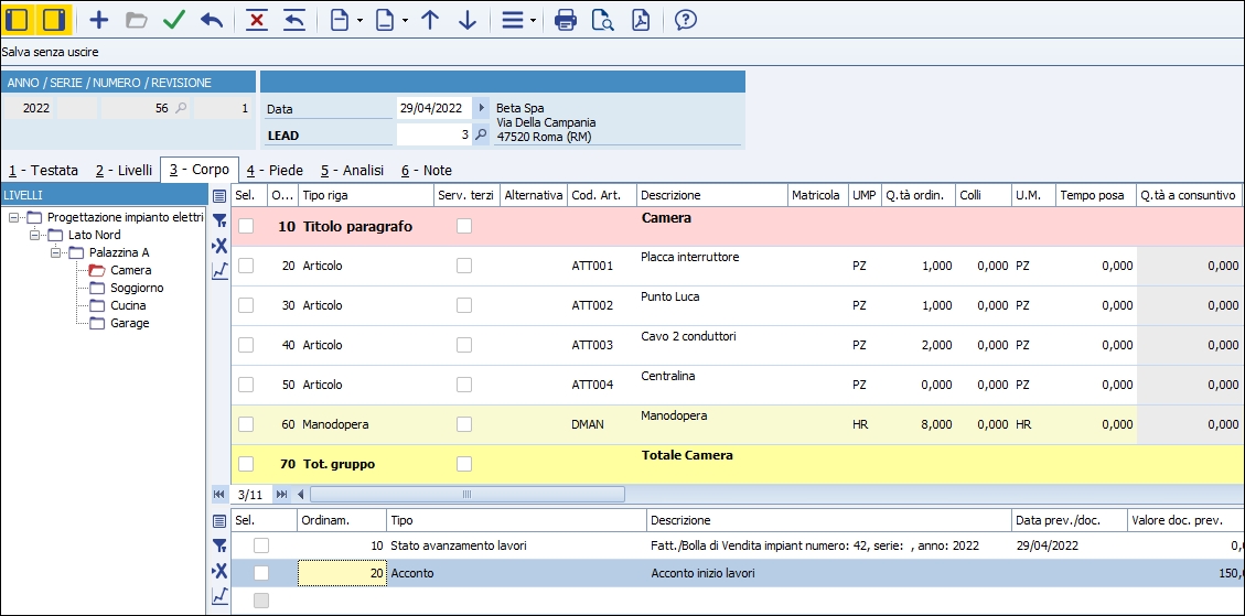 Il Modulo Preventivazione e consuntivazione impianti di Business rappresenta uno strumento utile per tutte quelle aziende o figure professionali (elettricisti, idraulici, installatori di ogni genere) che lavorano per commessa, dove il cliente assume un ruolo fondamentale alla definizione del prodotto finale. L'obiettivo di questo applicativo è quello di realizzare un progetto e definirne un budget preciso, monitorare le spese preventivate, quelle sostenute e quelle da sostenere, al fine di avere sempre un corretto stato di avanzamento dei lavori. Il modulo impiantisti può essere attivato tramite chiave da gestione Inizializzaz. comuni/globali, sezione Commerciale, modulo: Preventivazione e consuntivazione impianti (147) ed è consigliata la presenza del modulo Gestione di Magazzino e Vendite .
