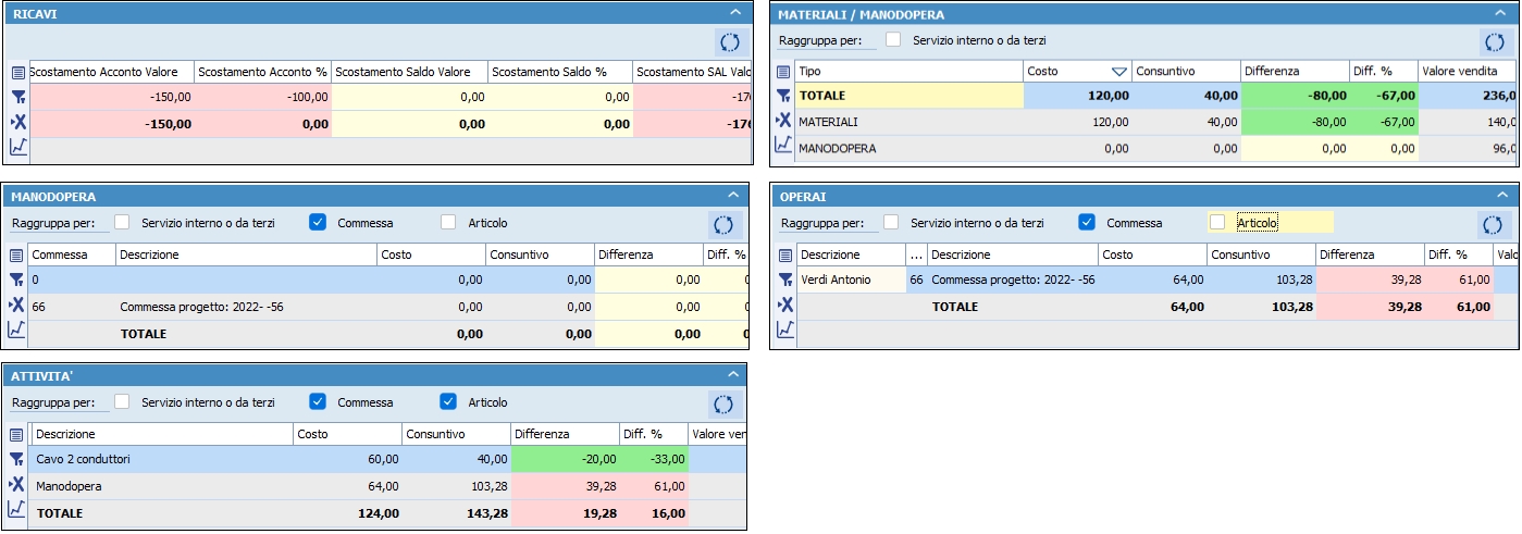 2) Controllo della marginalità del progetto in tempo reale e analisi dei parametri di redditività della commessa nel suo insieme o suddivisa per materiali/manodopera/servizi di terzi.