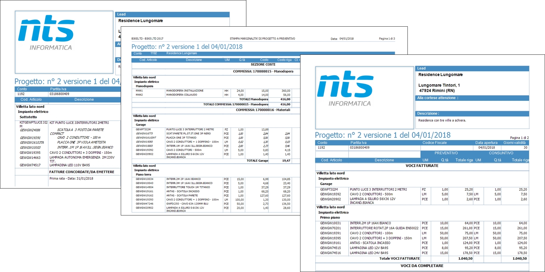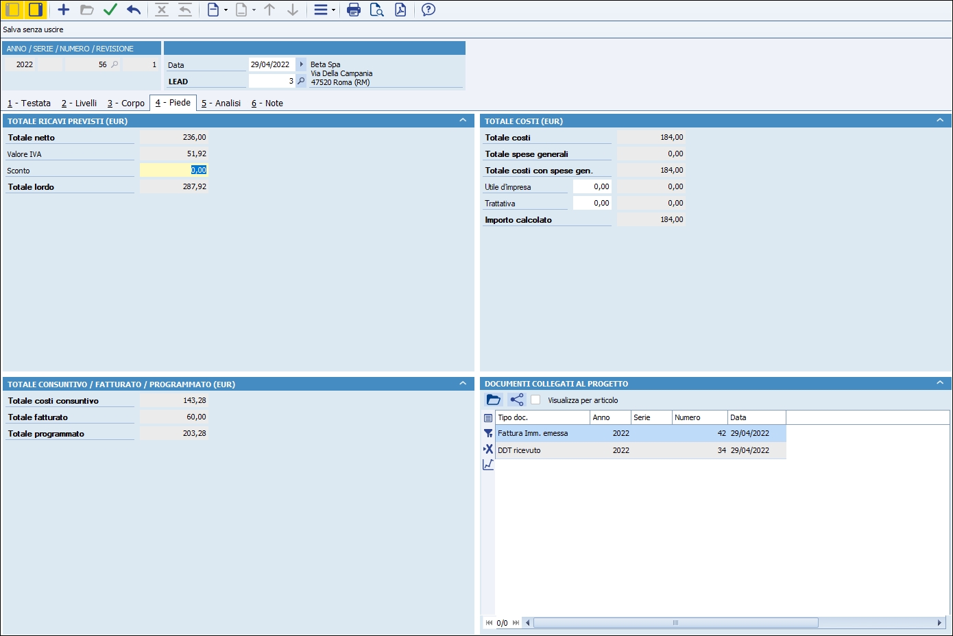 3) Consultazione delle spese generali, dei totali consuntivati e programmati grazie all'integrazione con i documenti di magazzino; Memorizzazione di tutti i documenti (files, immagini ecc...) collegati al progetto.