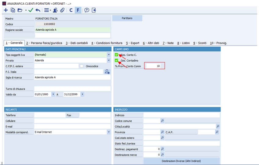Per quanto riguarda le prime, in anagrafica sono stati introdotti due campi che vengono utilizzati per riconoscere la tipologia di fornitore: Gestione conto commissione e Gestione a contadino. Sono visibili anche sui clienti ma l'utilizzo prevalente è per i fornitori, il primo campo identifica i fornitori per i quali si intende gestire il conto commissione (nella gestione documenti orto c'è uno zoom personalizzato che permette di selezionare solo i fornitori che gestiscono il conto commissione. Il campo gestione a contadino va sempre spuntato se presente la spunta su gestione conto commissione, serve per poter effettuare le vendite senza assegnare una partita specifica ma solo il fornitore. Indicare nel campo % Provv. Conto Comm. la percentuale di provvigione riconosciuta dal fornitore, se diversa da quella generica impostata nel registro di business ORTO\Provvigione e se attiva l'opzione ORTO\UsaCampoAn_hhprovvigione = -1.