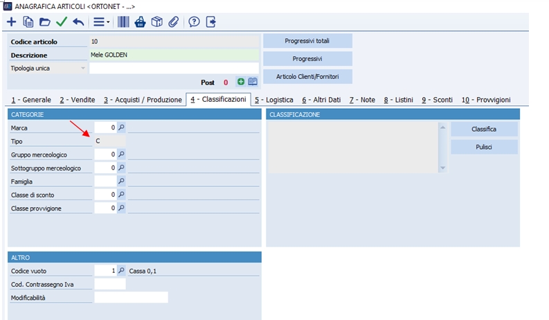 Il tipo articolo permette di definire la modalità di attribuzione delle vendite e conteggio delle rimanenze sulle partite: C significa che il conteggio deve essere fatto sui colli ovvero la partita verrà considerata chiusa quando la qunatità di colli venduti sarà pari a quella dei colli caricati anche se vi è una differenza di peso; viceversa indicando P la gestione verrà fatta sul peso (o meglio sull'unità di misura principale, che può anche essere numero di mazzi per la rucola, o numero di "padelle" per i prodotti già confezionati). In questo caso la partita viene considerata chiusa conteggiando le quantità caricate/vendute.