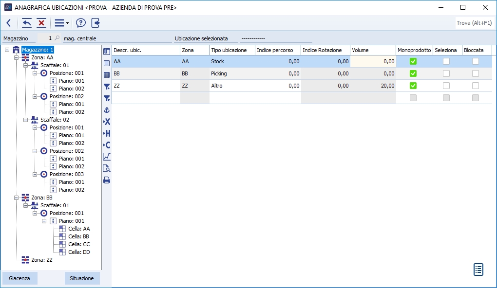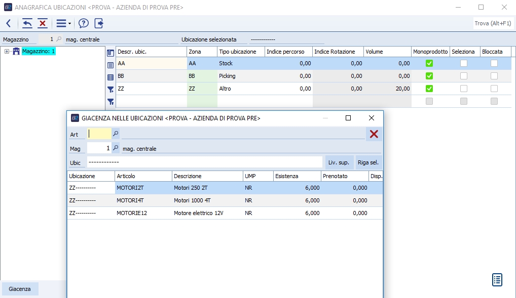 Salvato il ddt ricevuto appena inserito se torniamo nell'anagrafica delle ubicazioni, possiamo visualizzare la giacenza delle ubicazioni tramite l'apposito tasto Giacenza