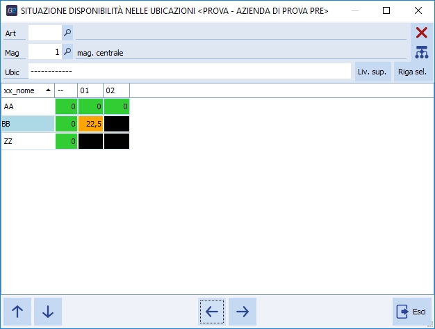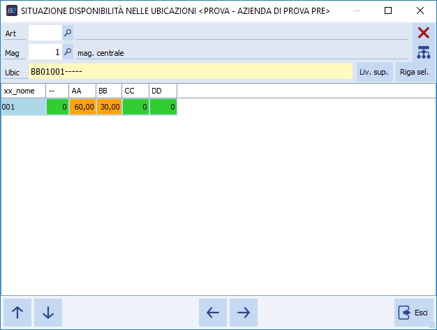 Ora tornando nuovamente alla finestra di giacenza troveremo che gli articoli sono stati efffettivamente spostati sulle ubicazioni BB01001001AA e BB01001001BB svuotando la ZZ----------