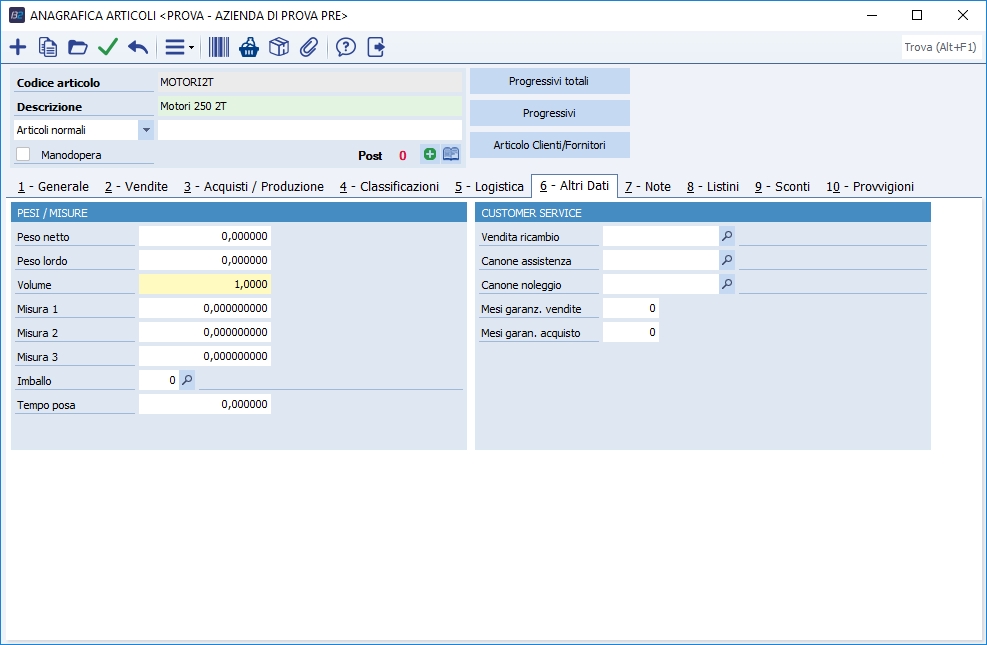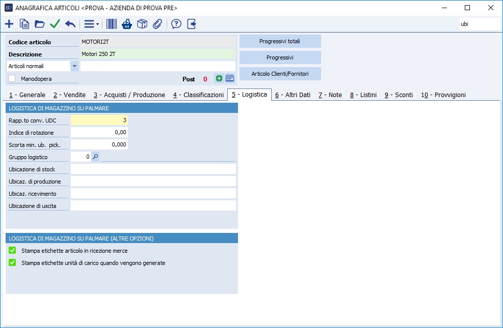 e impostiamo nel tab altri dati un volume, nell'esempio è impostato uguale a 1, cioè ogni unità di UMP dell'articolo occupa una unità di volume dell'ubicazione (da noi per semplicità tutte impostate a 20).