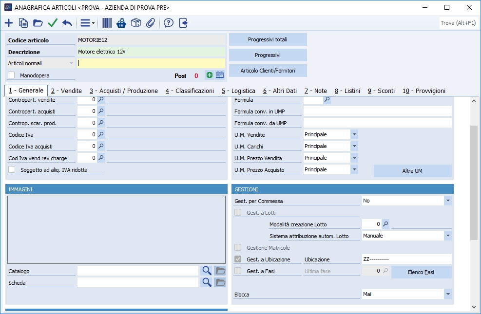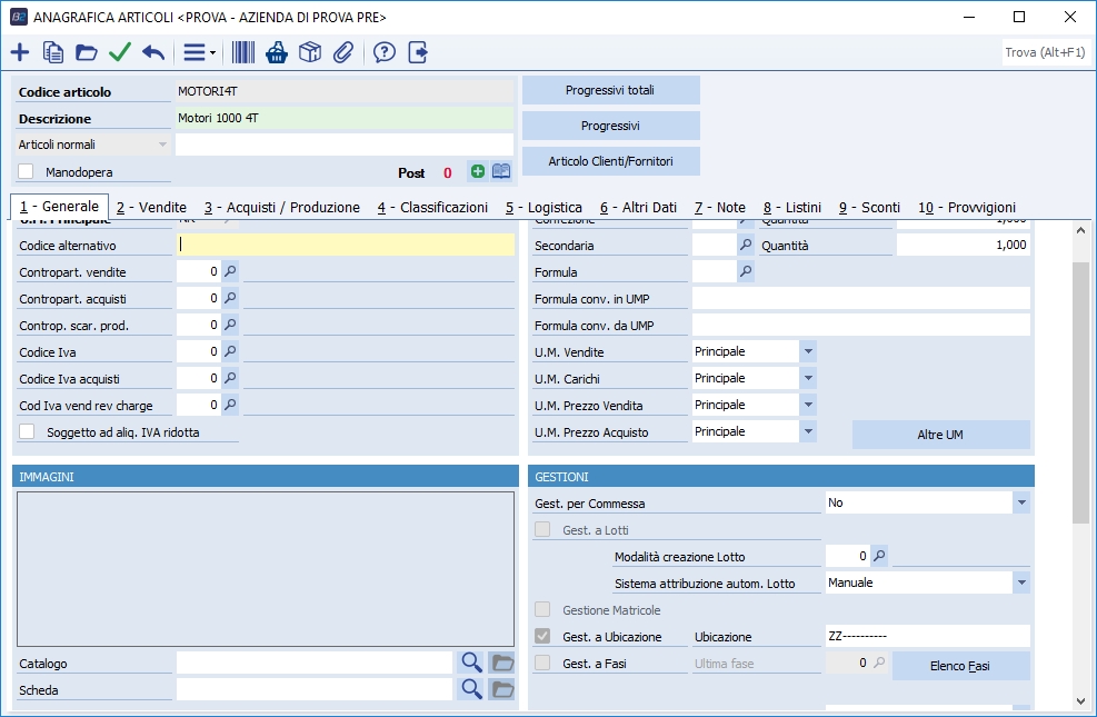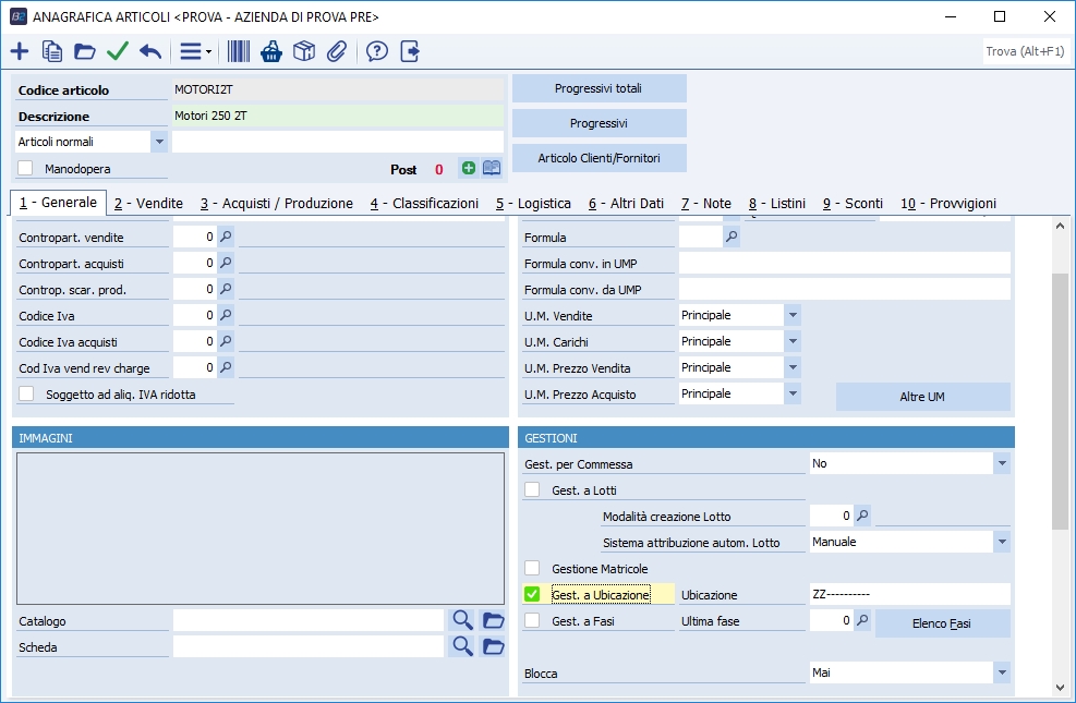 A questo punto creiamo 3 articoli a piacere, specificandone l'ubicazione di default nel tab generale e impostando il flag Gest. a Ubicazione