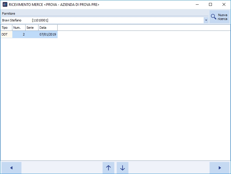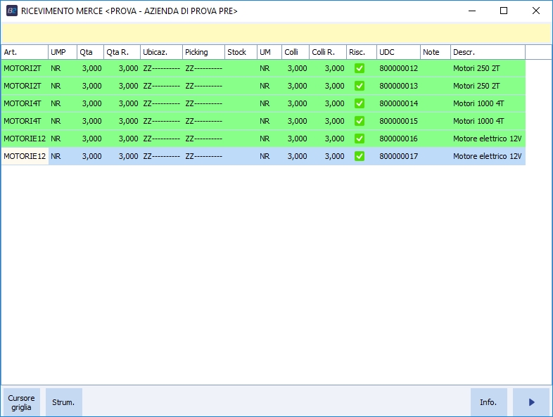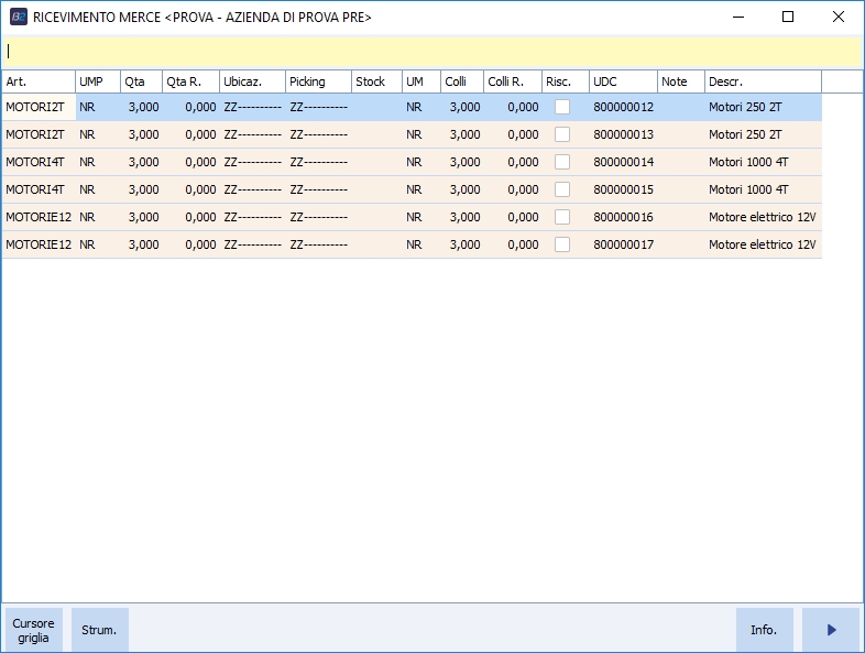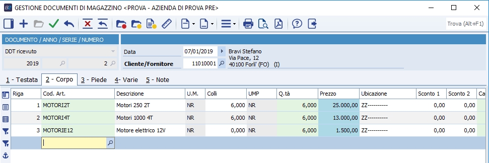 Ora creaimo un nuovo ddt ricevuto sul magazzino 1, inserendo una riga per ogni articolo creato in precedenza con una quantità pari a 6, notiamo che viene proposta l'ubicazione impostata sull'articolo ZZ----------.