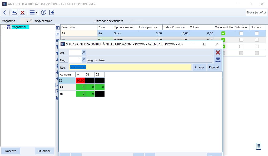 oppure con il tasto Situazione possiamo vedere la percentuale di volume occupata delle varie ubicazioni, nell'immagine sotto infatti troviamo che i 18 pezzi caricati sull'ubicazione ZZ----------, occupano un volume pari a 18/20 che corrisonde appunto al 90 percento (cella rossa).