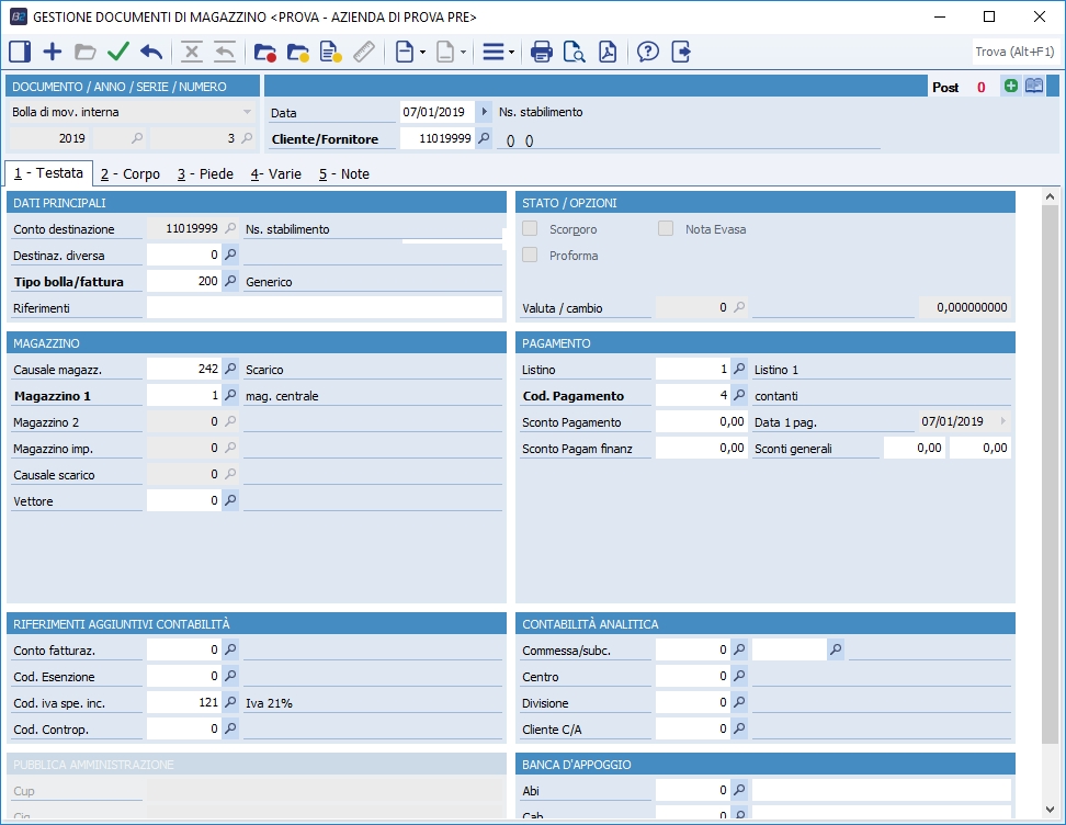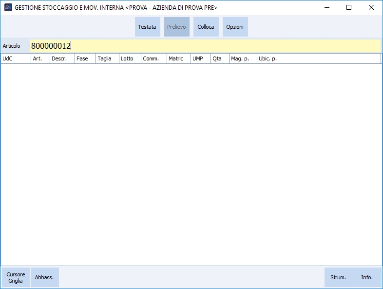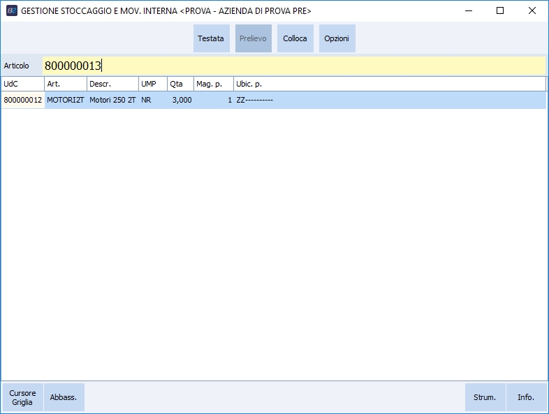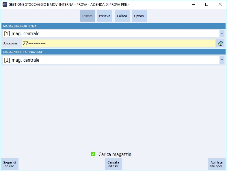 e completiamola, accediamo poi al programma di movimentazione interna e impostiamo il prelievo della merce appena riscontrata, partendo dal magazzino 1 ubicazione ZZ----------