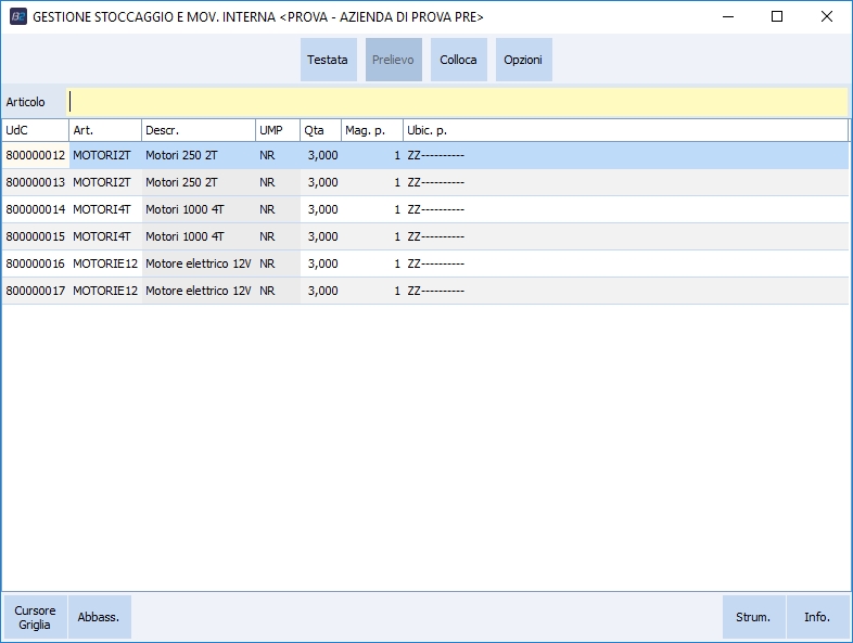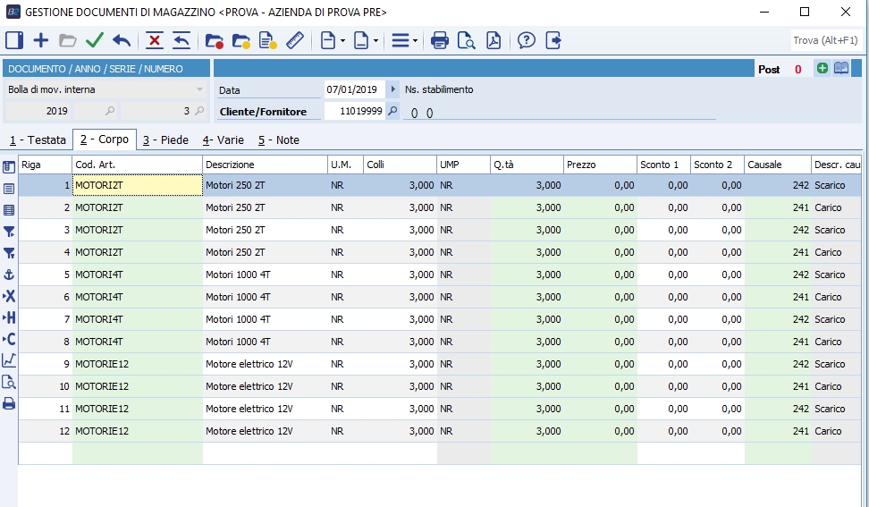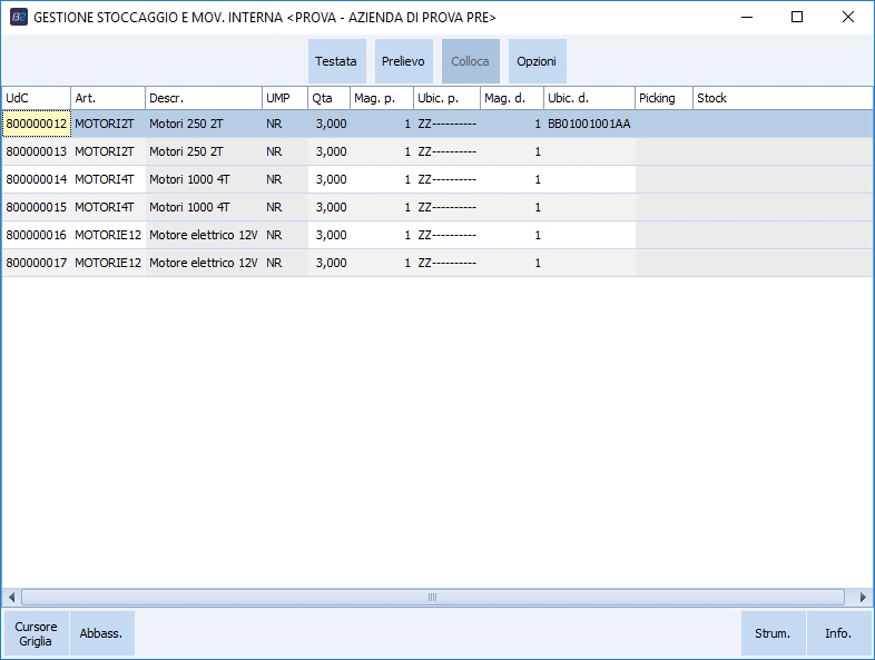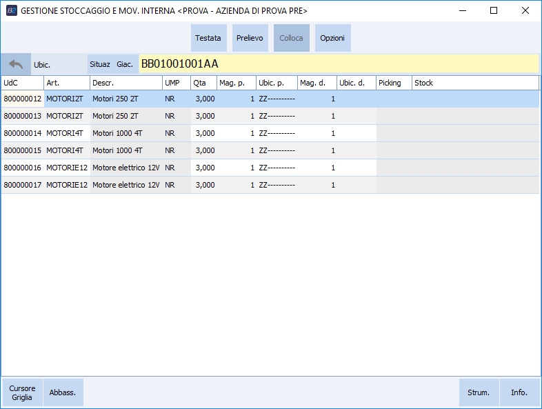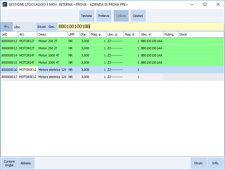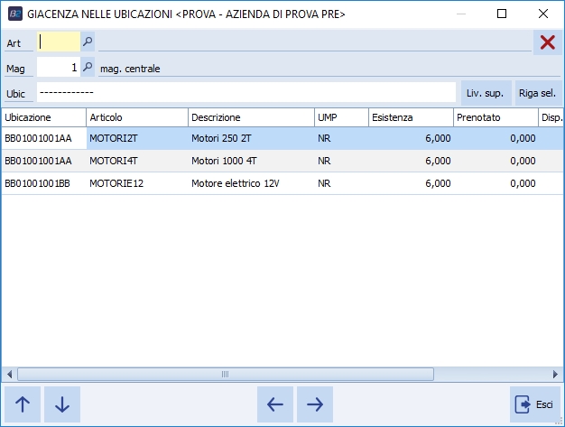 nel nostro esempio collocheremo gli articoli MOTORI2T e MOTORI4T nell'ubicazione BB01001001AA