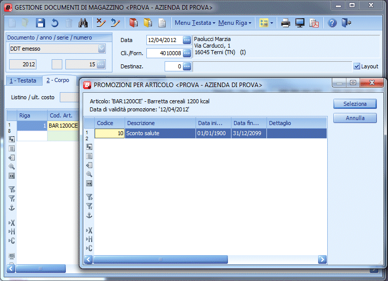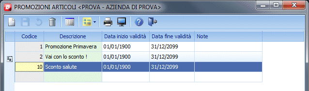 L'impostazione dei dati relativi alle promozioni (da visualizzare inserendo righe di impegni clienti o DDT o fatture emesse) la si attua utilizzando i programmi 'Promozioni articoli' (dal menu di Business 1.K.9) e, eventualmente a supporto, da 'Dettagli promozioni' (dal menu 1.K.N). Caso 4: Abilita_Promozioni=-2 e Promozioni_come_Rel10=0 Quest'ultimo caso, come il precedente, permette all'inserimento dell'articolo di visualizzare una form che contiene le promozioni attualmente valide e di selezionarne una con la differenza che, in caso di presenza di una sola ed unica promozione in vigore questa viene selezionata automaticamente: il prezzo in promozion ed il cod. promozione vengono riportati sulla riga del documento.