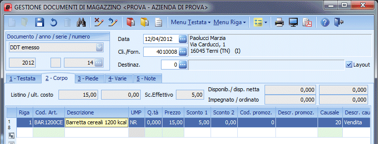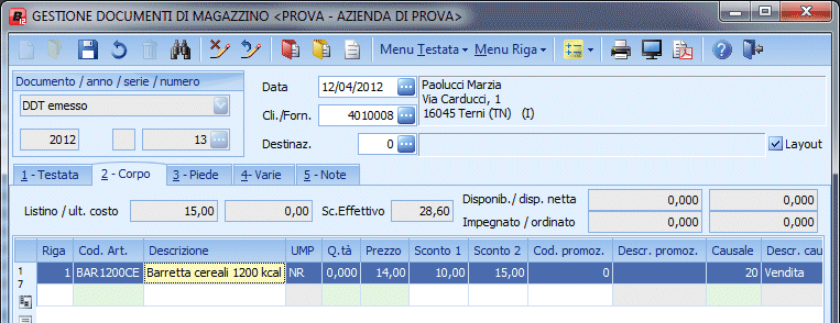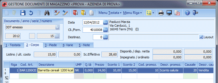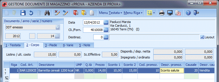 Caso 1: Abilita_Promozioni=0 e Promozioni_come_Rel10=-1 (configurazione di default) In questa casistica se inseriamo un documento, all'inserimento dell'articolo vengono rilevati sconti, prezzi e provvigioni e se per qualcuno di questi è presente una provvigione valida, ha precedenza (NB: non viene compilato il codice di promozione di riga).