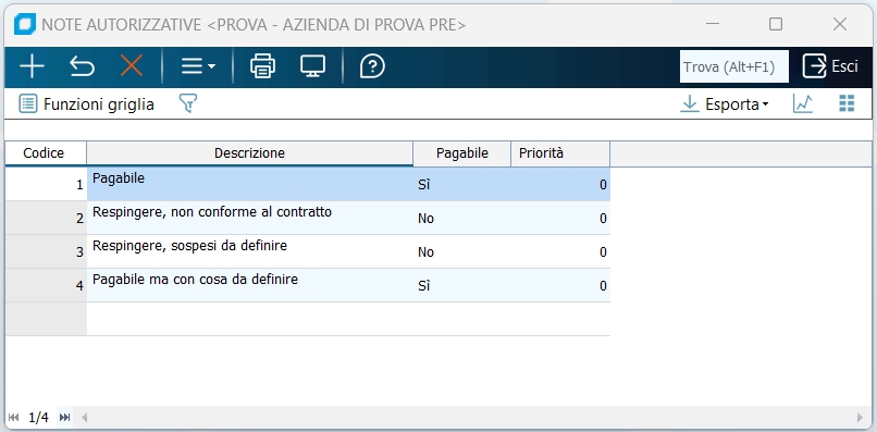Impostazione delle nuove tabelle Note autorizzative Introduce il concetto di credito e/o debito pagabile/non pagabile. Questi codici possono poi essere assegnati alle varie righe dello scadenzario e dello scadenzario extracontabile. Le informazioni da inserire per creare i vari codici note autorizzative sono: il codice, la descrizione e l'attributo se è pagabile o no mentre il campo priorità non è gestito. Questo attributo permette di definire sui debiti se sono pagabili o non pagabili mentre sui crediti se sono incassabili o non incassabili. È quindi un'informazione ulteriore che si va ad aggiungere agli altri status di autorizzato e poi saldato. Si instaura così un livello in più nel work flow di incasso/pagamento. NB: non è obbligatorio inserire un codice nota autorizzativa sulle scadenze.
