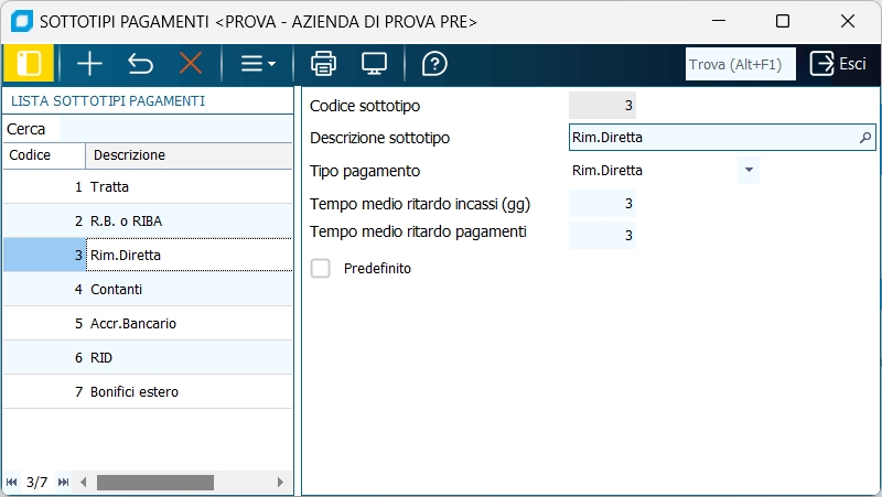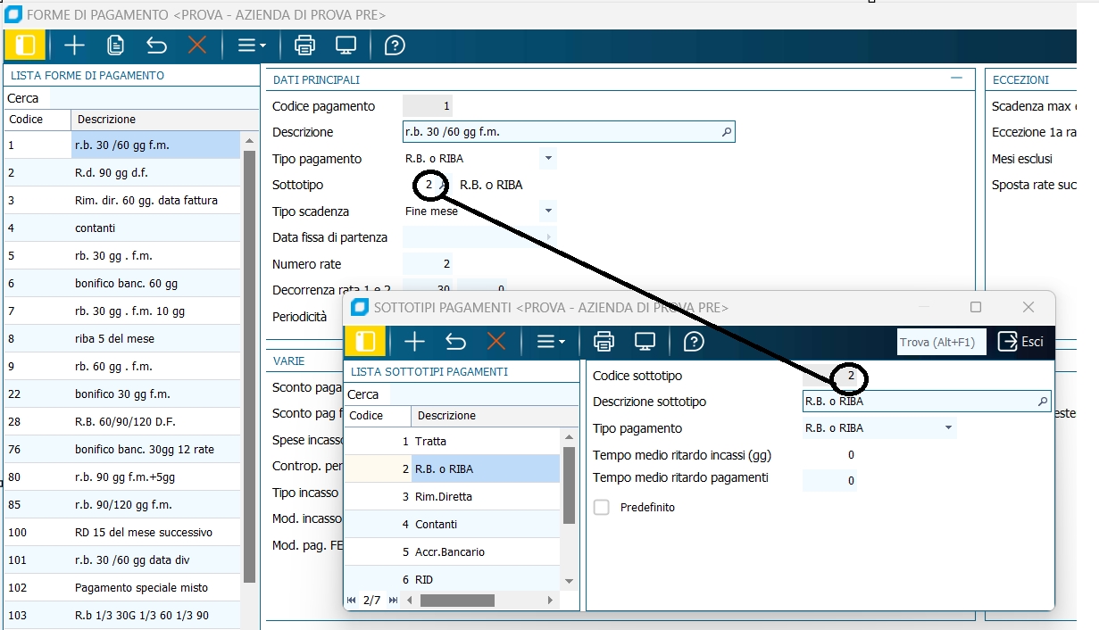 In fase di installazione/conversione ad ogni tipo di pagamento viene creato un sottotipo corrispondente e poi assegnato alla tabella delle forme di pagamento nel campo del sottotipo (codici 1, 2, 3, 4, 5). È obbligatorio indicare il codice sottotipo pagamento nelle varie forme di pagamento.