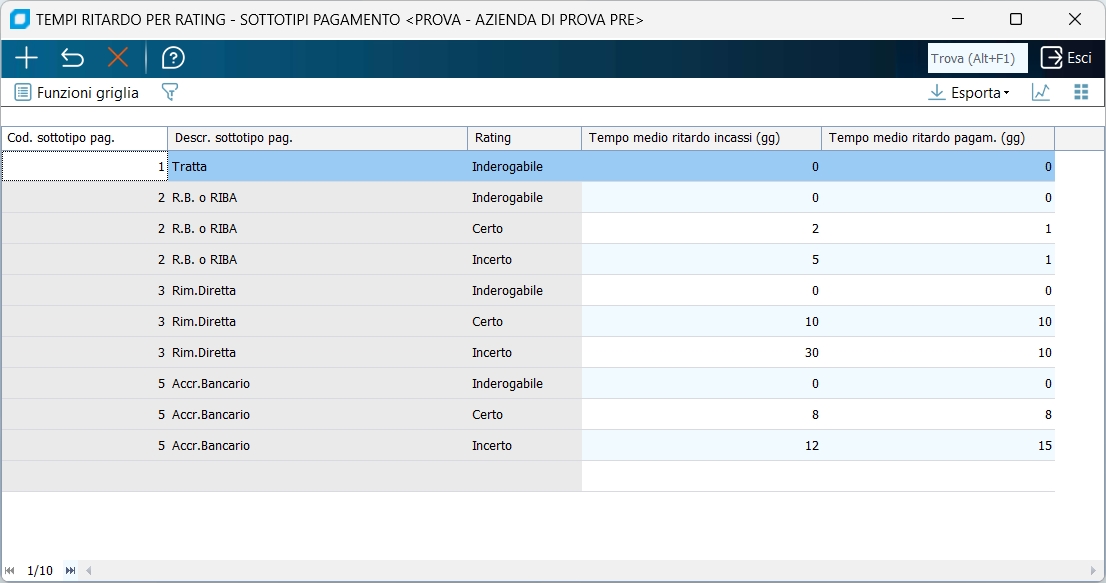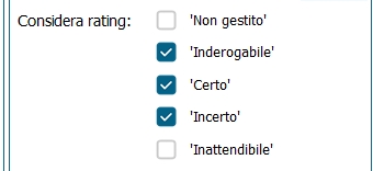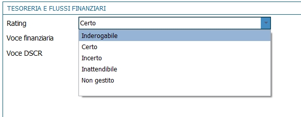 Rating finanziario (o 'rating', da non confondere con il campo 'affidabilità') ha dei valori fissi: 1=inderogabile, 2=certo, 3=incerto, 4=inattendibile. Questa non è configurabile ed è fissa in Business viene mostrato nel programma di "stampa analisi finanziaria"