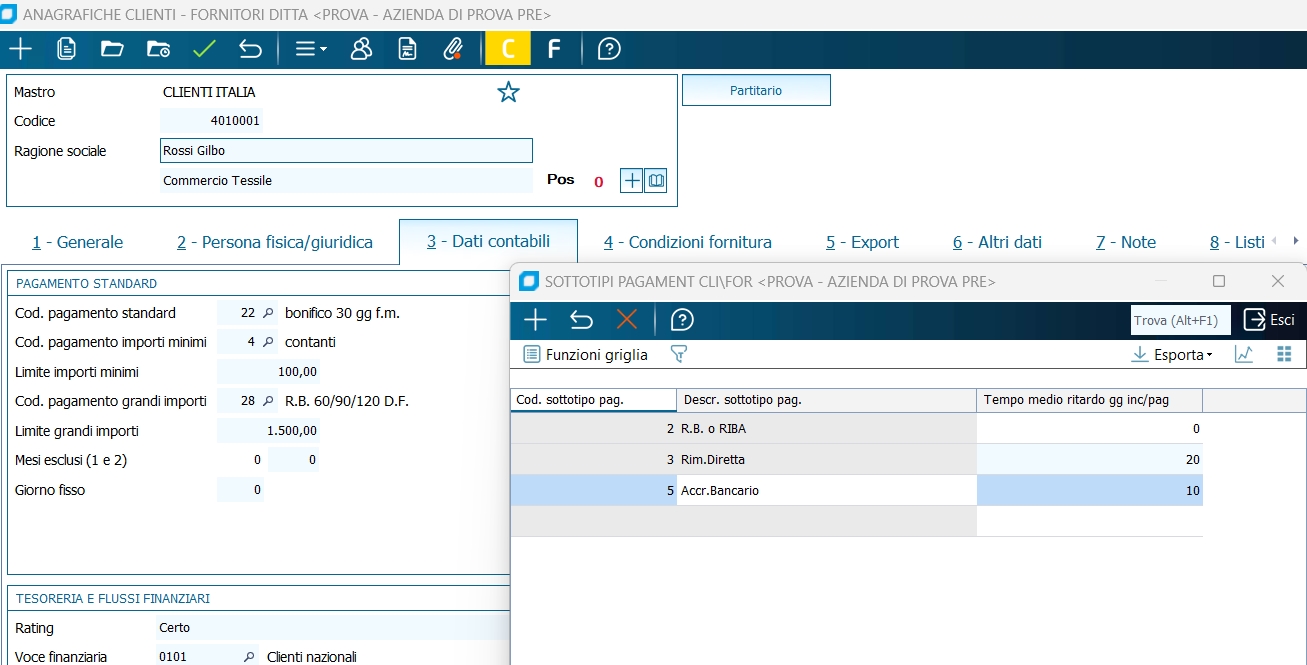 Nell'anagrafica clienti/fornitori (e per sottoconti) è stato inserito il combo rating finanziario e il cod. voce finanziaria dettaglio.