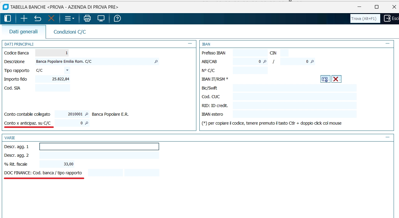 Campi aggiunti su tabelle esistenti Nella tabella pagamenti è stato inserito il campo cod. sottotipo da impostare su tutti i cod. pagamento obbligatoriamente (le procedure di conversione archivi operano già in tal senso). Nella tabella delle banche sono stati inseriti due campi in più per realizzare il collegamento alla tabella rapporti bancari di DocFinance (codice banca e tipo rapporto, quando è richiesta integrazione con DocFinance, i codici da specificare sono quelli di DocFinance non quelli di Business), più conto per anticipi su conti di tipo SBF e il 'Saldo anticipazioni su C/C da conto portafoglio' da indicare se parto da un dato che non è l'inizio e devo dare la quota di sbf che ho anticipato (che ho finanziato).