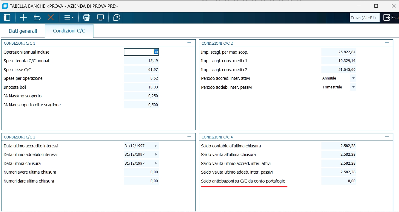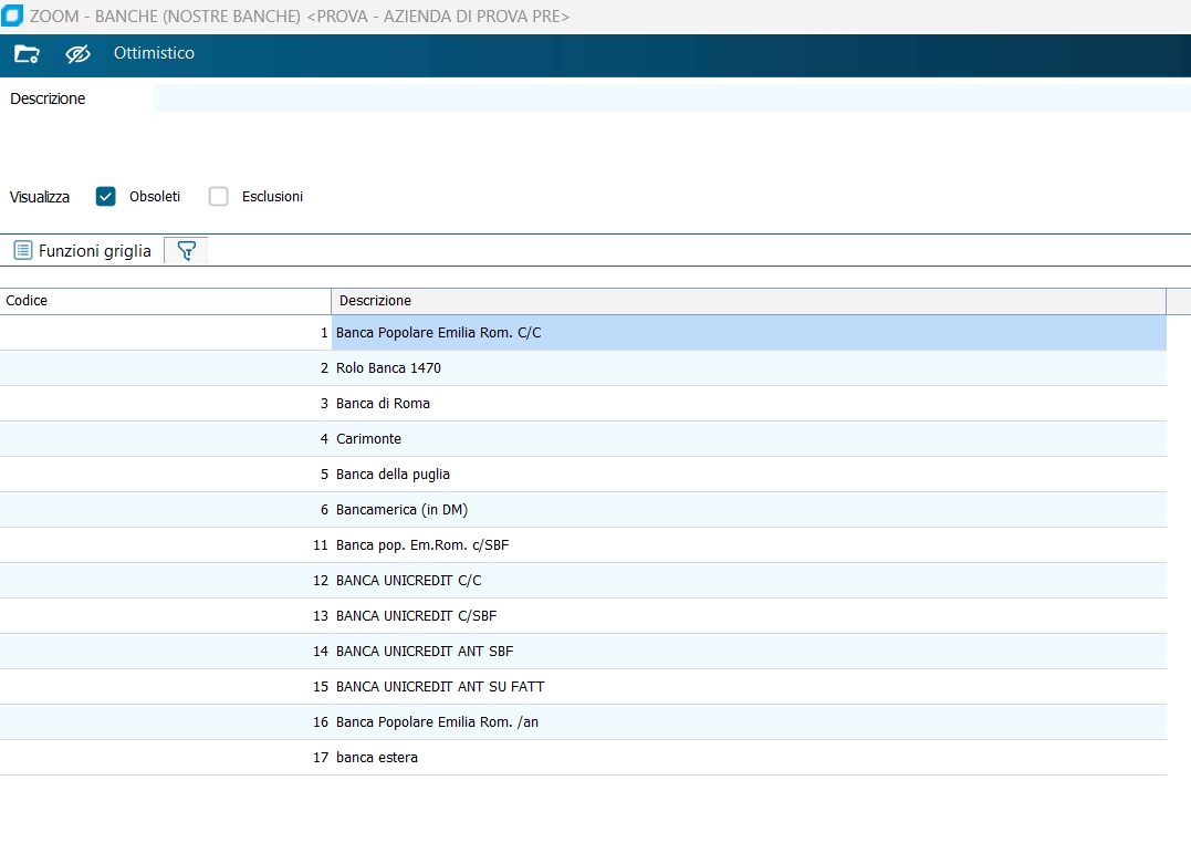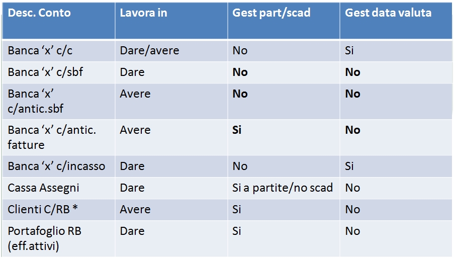 *=senza chiudere il cliente I conti di tipo Banca x c\c vanno gestiti a data valuta. Il conto Banca x c/sbf non va gestito a data valuta. Questa è una differenza rispetto alla gestione con la vecchia tesoreria. Non abbiamo bisogno di gestire la data valuta in quanto la disponibilità nel tempo collegata a questo conto è (leggiamo dalle scadenze degli effetti) canalizzata sui vari conti Il conto Banca x c/anticipi sbf non va gestito né a partite né a scadenze. Questo conto serve a gestire l'anticipo su sbf. Se anticipo dei soldi sul portafoglio presentato si tratta di un finanziamento e quindi la rappresentazione più corretta é farlo comparire tra i debiti. Per cui se viene fatto un anticipo sull'sbf non devo chiudere il conto sbf ma devo aprire il conto anticipi su sbf. Il conto Banca x c/anticipi su fatture va gestito a partite e scadenze (non serve gestirlo a data valuta). Per quanto riguarda il giro del conto anticipi sulle fatture è un conto simile al conto anticipi su sbf ma non ho il conto ri.ba. (Effetti attivi) a monte. Cassa assegni è un conto utilizzato per la gestione degli assegni post-datati ricevuti. Deve essere gestito a partite ma non a scadenze. Può anche essere gestito non a partite ma gestito a data valuta. È un vantaggio il fatto di gestirlo a partite in quanto mi consente di consultare il partitario 'A partite'. Non è fondamentale in quanto ho un archivio degli assegni dal quale posso visualizzare quali assegni sono aperti e quali no. Il conto Clienti c/rb gestito va utilizzato quando emetto gli effetti e non chiudo il cliente. È un conto di tipo Sottoconti e va gestito a partite e scadenze. Esempio di codifica delle banche Le tipologie di rapporti bancari gestiti sono 4: 1. conto corrente; 2. conto salvo buon fine; 3. conto anticipi salvo buone fine; 4. conto anticipi su fatture Un esempio di codifica può quindi essere il seguente: Conto corrente