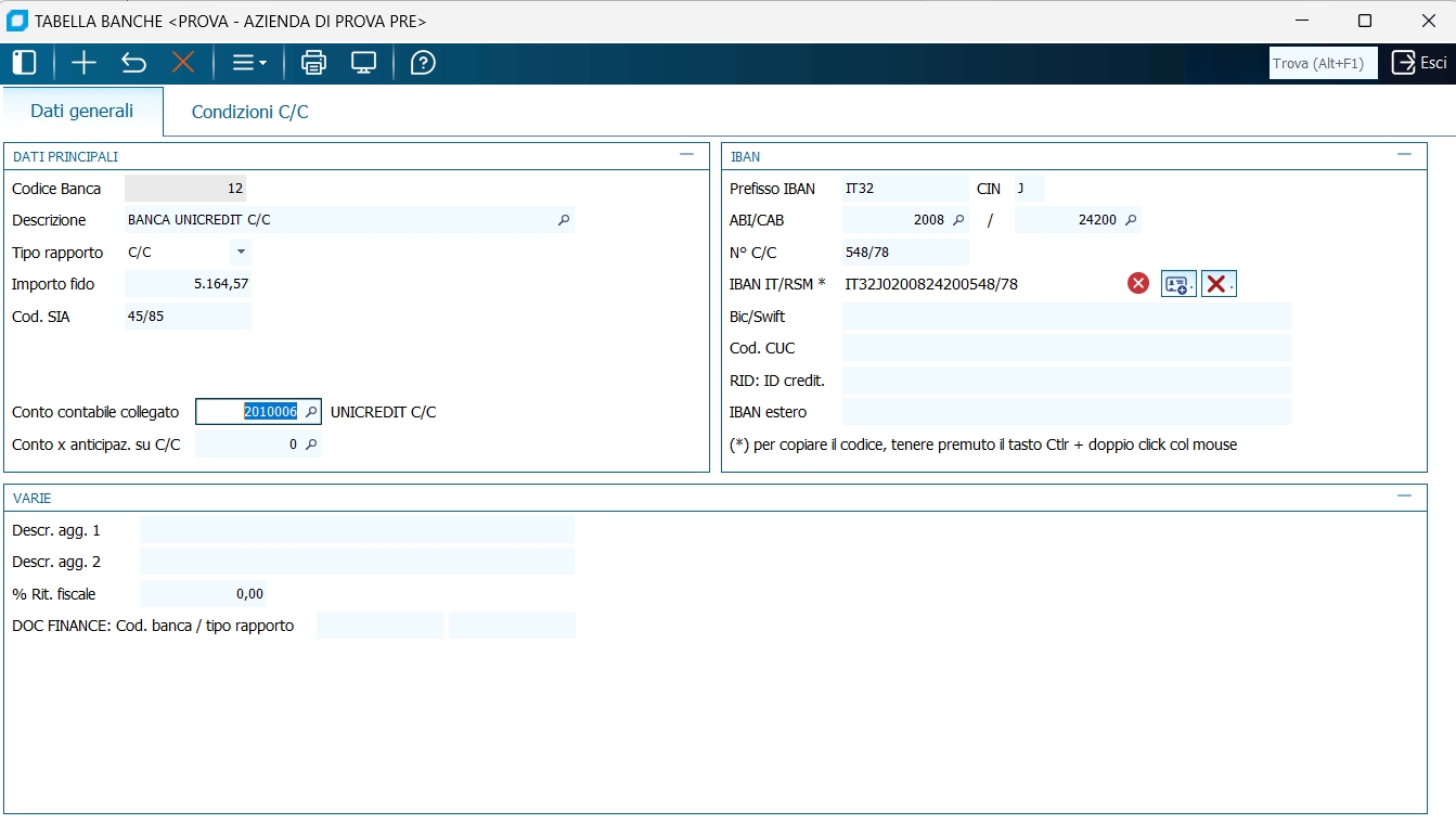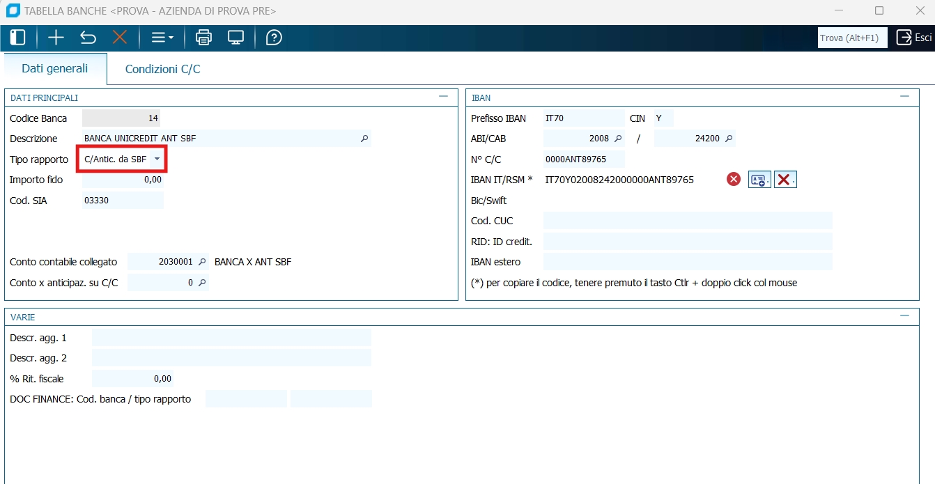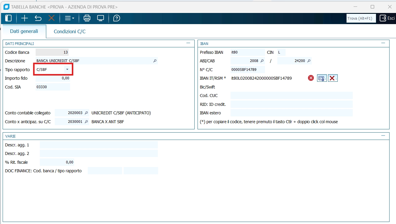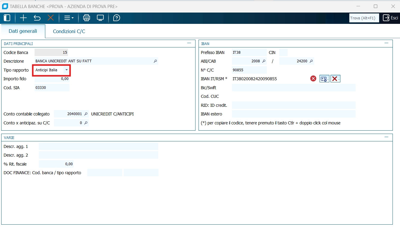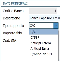 Un altro campo aggiunto nella tabella banche è il tipo rapporto, che in presenza di stessi codici di ABI e CAB permette di specificare più record dove varierà il tipo rapporto, ovvero quando codifico codici banca accomunati codici ABI e CAB, inserirò due codici banca che sono riferiti a tipi di rapporto diversi, quindi la presenza di stesso ABI e CAB significa che è la stessa banca.