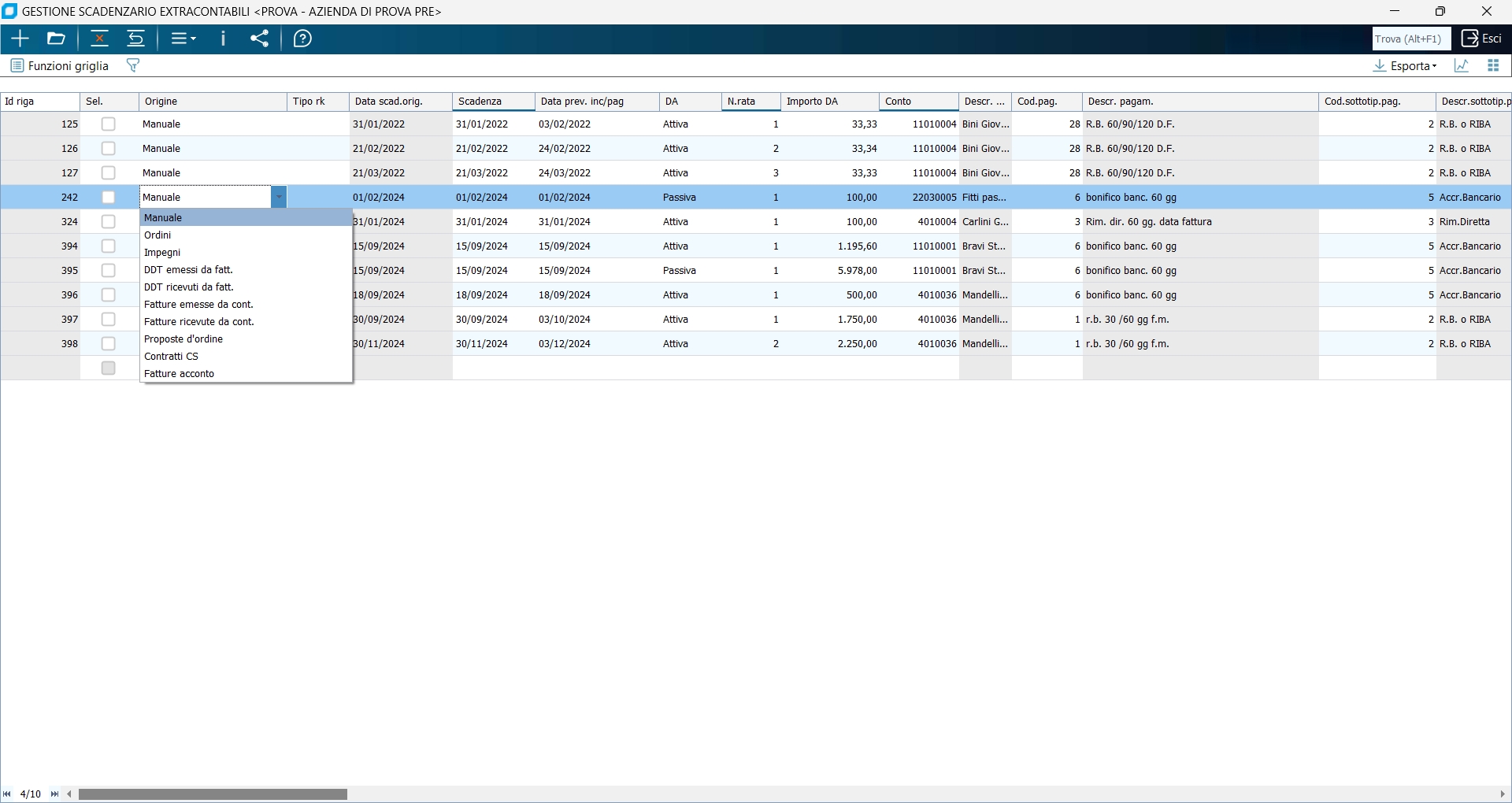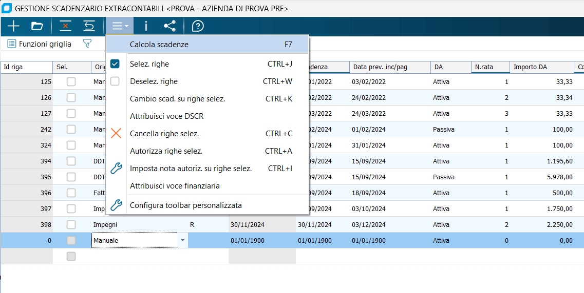 Invece la data prevista inc.\pag. viene calcolata applicando i giorni medi di ritardo incasso\pagamento in base alle priorità indicate precedentemente. Attualmente per escludere rate di scadenzario che sono già scadute non c'è un automatismo che da gestione prima nota me le vada 'a saldare', l'unico modo per escluderle è quindi CANCELLARLE. L'archivio delle scadenze extra-contabili almeno per le scadenze manuali sono costretto a eliminarle. Per cui prima di fare un'analisi finanziaria l'operatore deve entrare nell'archivio delle scadenze extra contabili e cancella la riga di scadenza. Ci sono le stesse informazioni che abbiamo nello scadenzario per avere una vista complessiva, in questo modo nel datawarehouse posso avere una visione globale sia di informazioni che sono in contabilità che di informazioni che non sono in contabilità. C'è un aspetto da considerare riguardo lo scadenzario extra-contabile: la generazione automatica cancella tutto e rigenera le scadenze (a parte quelle manuali). Per cui se nello scad. extracontabile avessi modificato con delle note autorizzative alcune delle scadenze generate da Business queste verrebbero perse (interventi manuali). Per evitare che le scadenze vengano rielaborate va messa la spunta su 'Data prevista bloccata.' Per l'inserimento di scadenze multiple manuale, è possibile inserire più righe in modo massivo tramite la funzione calcola scadenze, basta inserire una nuova riga e richiamare la voce 'calcola scadenze' dal menu strumenti.