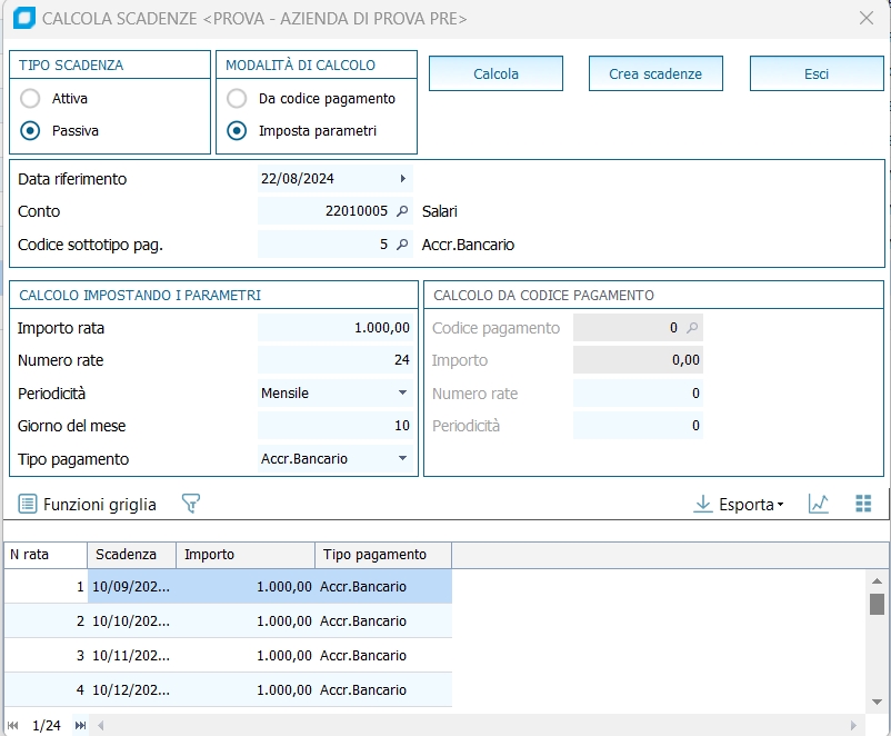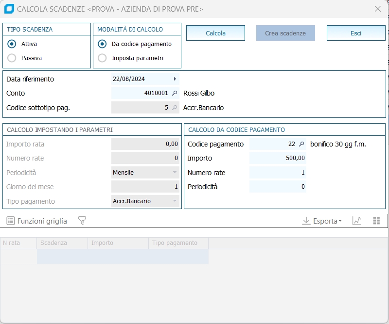 A questo punto posso scegliere due modi di esplosione o da calcolo da codice di pagamento (specificando un codice di pagamento, la data di riferimento e l'importo complessivo del finanziamento) o tramite l'impostazione di parametri (inserendo una data di riferimento, l'importo della rata singola, il numero di rate, in quale giorno del mese si paga la rate). Scelto il modo e configurato occorre poi fare calcola per avere una anteprima delle rate generate (mi consente di modificare a video le rate).