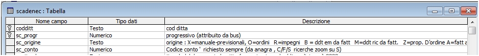 Nuovo archivio delle scadenze extra contabili Tale archivio è gestito dalla nuova tabella SCADENEC, che non è legata però a registrazioni contabili e non contiene il concetto di numero rata, ma ha un progressivo numerico, in parte gestito a mano tramite scadenze inserite manualmente dall'operatore ed in parte generate da Business prelevando i dati da ordini, ddt da fatturare, proposte d'ordine, ... Come struttura è simile alla tabella SCADEN, ma non impone registrazioni contabili, quindi da un punto di vista tecnico la chiave non è più individuata da conto\anno\serie\num. doc.\num. rata ma è un progressivo numerico. La struttura di SCADENEC (differenze rispetto a scaden):