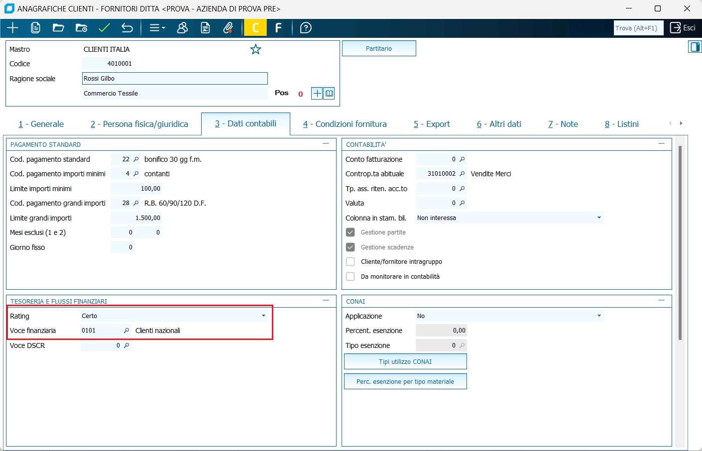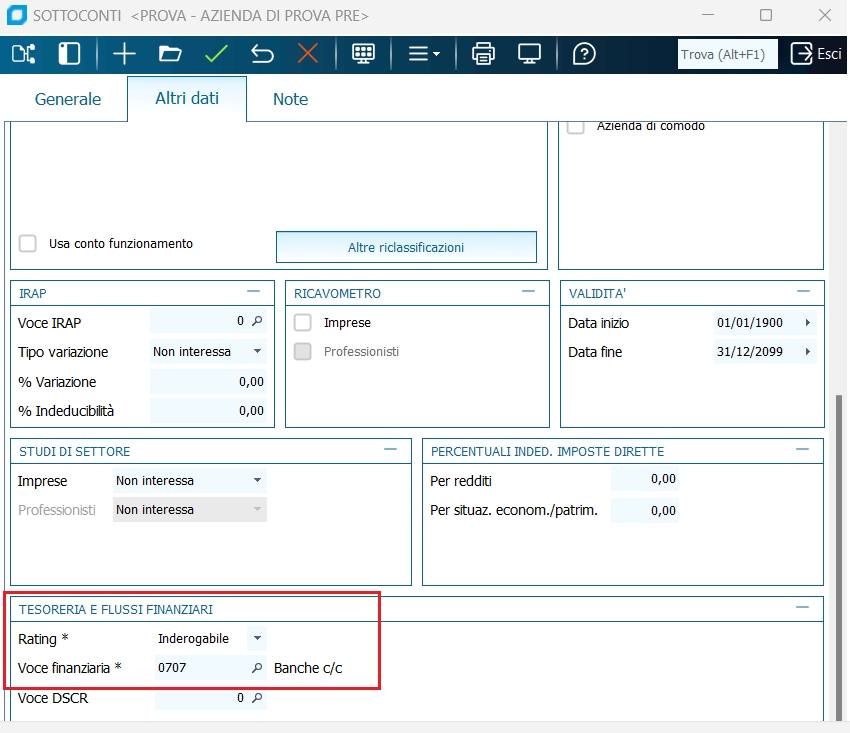 - Sui clienti, fornitori e sottoconti che danno origine a scadenze contabili ed extracontabili inserire un codice di voce finanziaria. Sono tipicamente le seguenti tipologie di sottoconti: Erario c\Iva, Dipendenti c\retribuzioni, Banche c\mutui, banche c\leasing