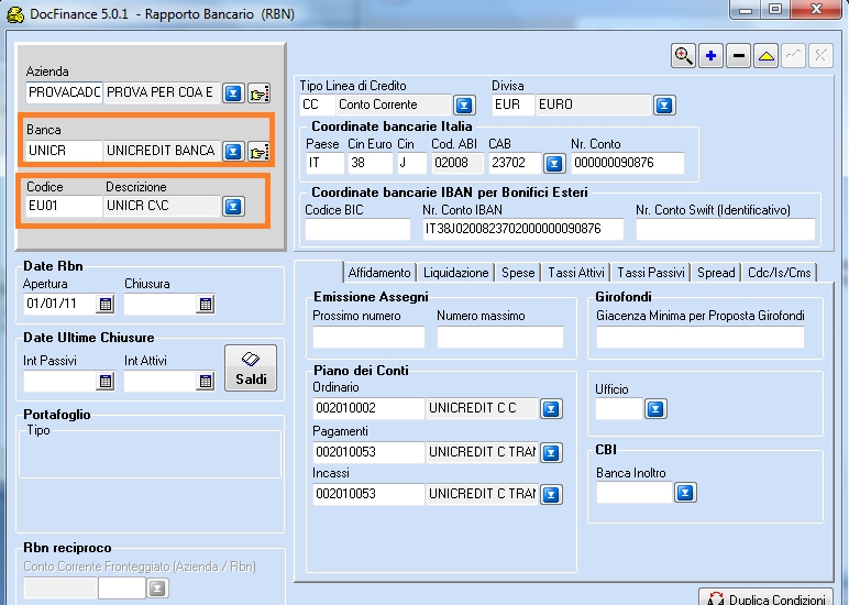 - Canalizzazione: su quale conto dell'azienda si prevede di incassare o pagare. codice del conto di canalizzazione è un attributo della scadenza. Il codice di canalizzazione si trova sia sull'anagrafico che sulla scadenza. Su Doc-Finance saranno impostati il codice della banca e del RBN (rapporto bancario);