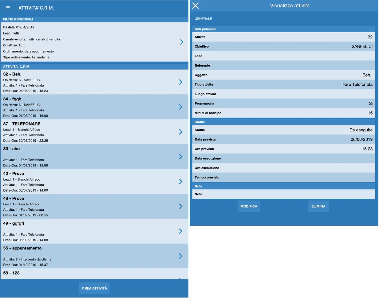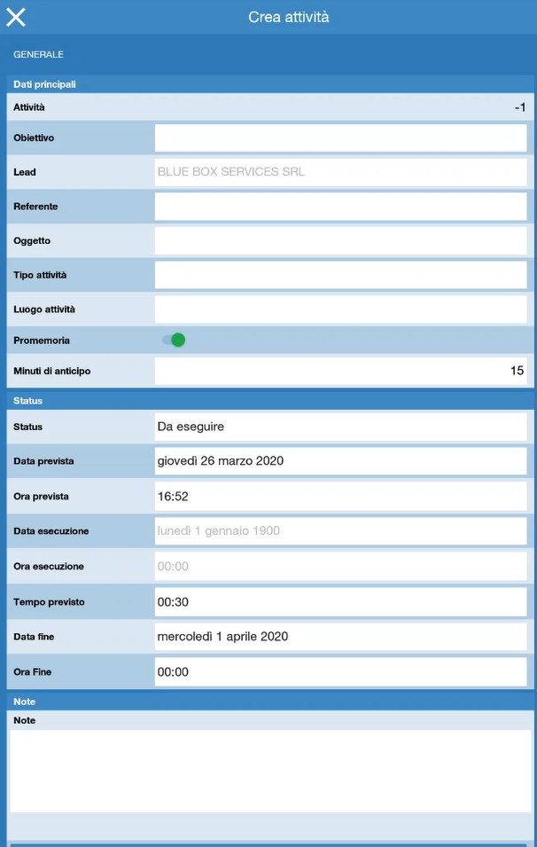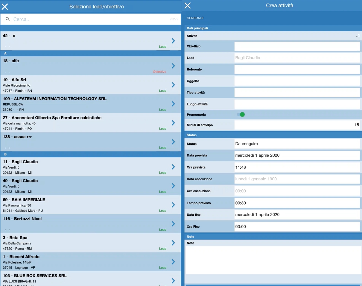 E' possibile creare nuove attivitą direttamente dal dispositivo, selezionando l'obiettivo o lead su cui imputare l'attivitą CRM: