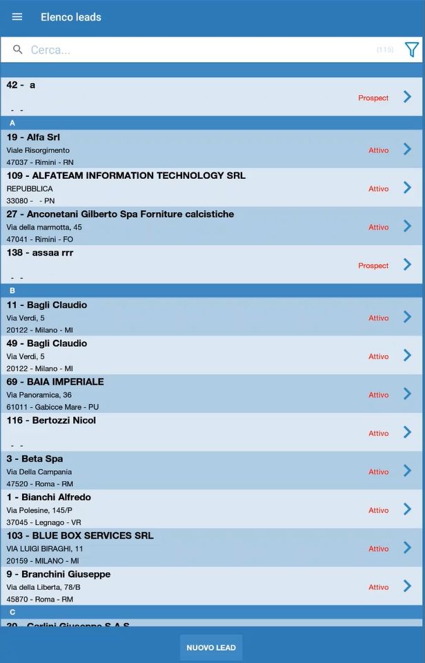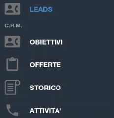All'interno della sezione LEADS č possibile cercare i leads, usando anche i filtri preimpostati (Tipo, Status, Nazione, Provincia, Categoria, ecc.).