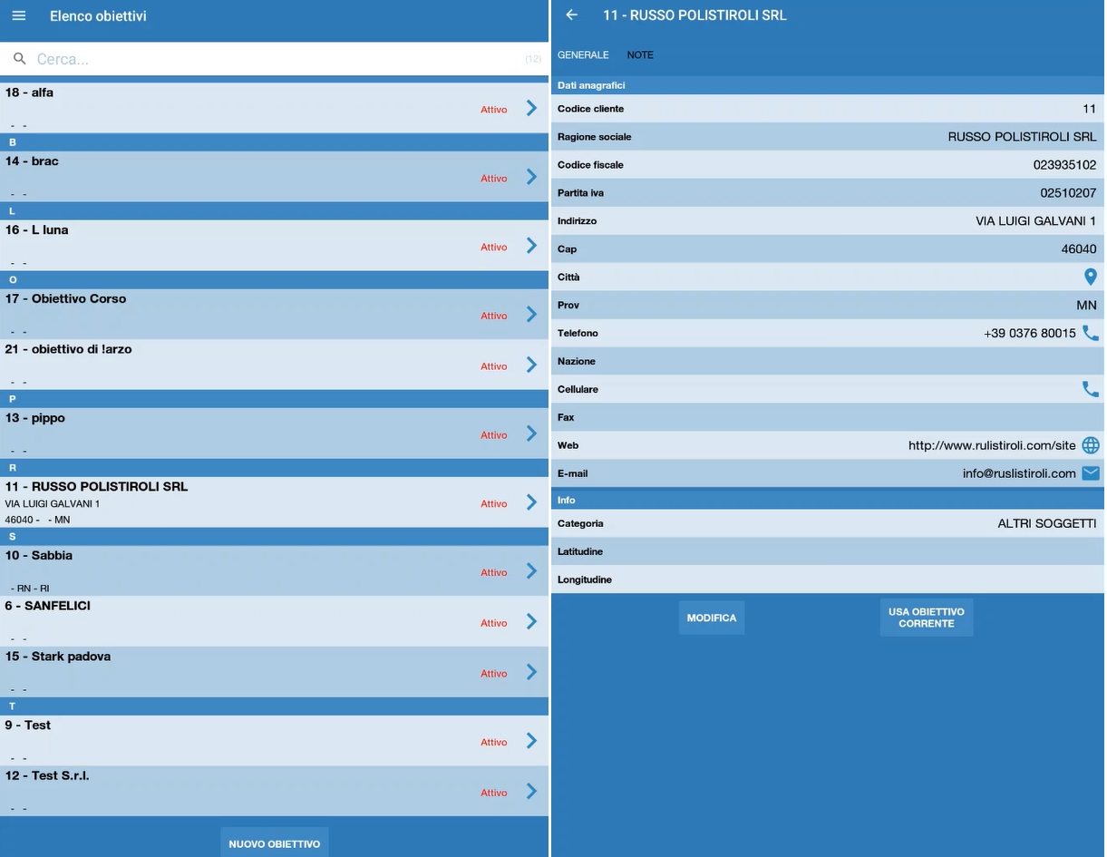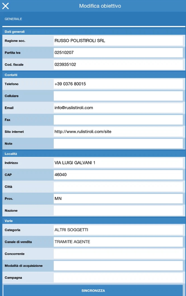 Cliccando sull'obiettivo si entra nella maschera di modifica, sono gestiti i campi principale dell'anagrafica e tutte le eventuali estensioni.